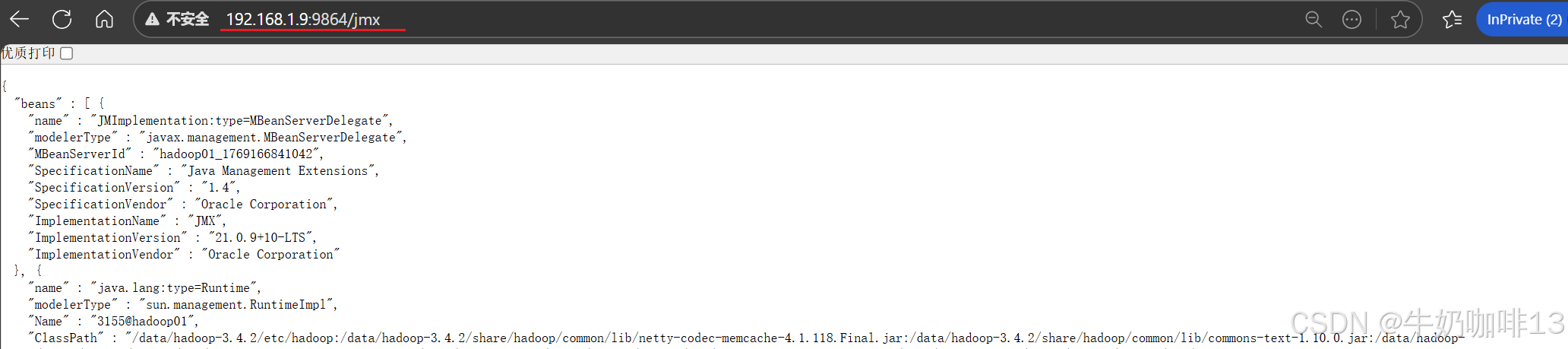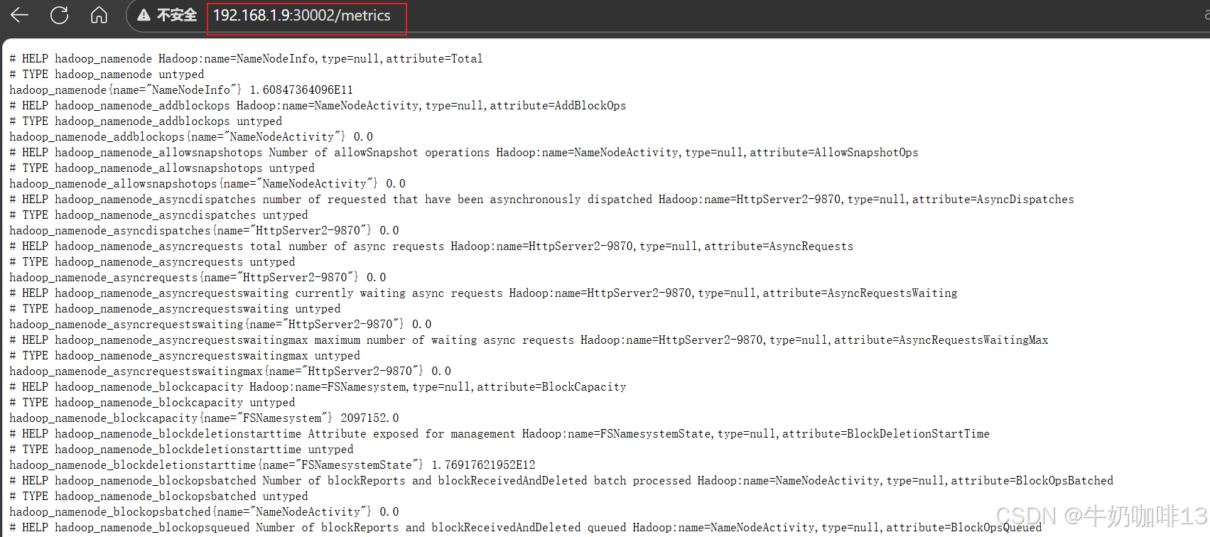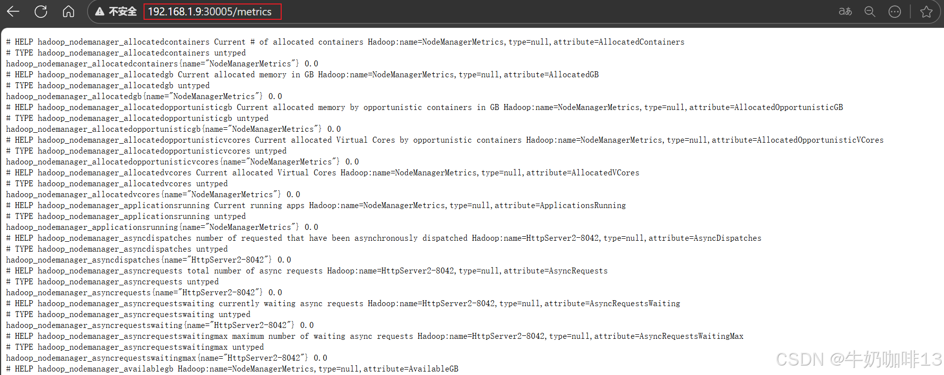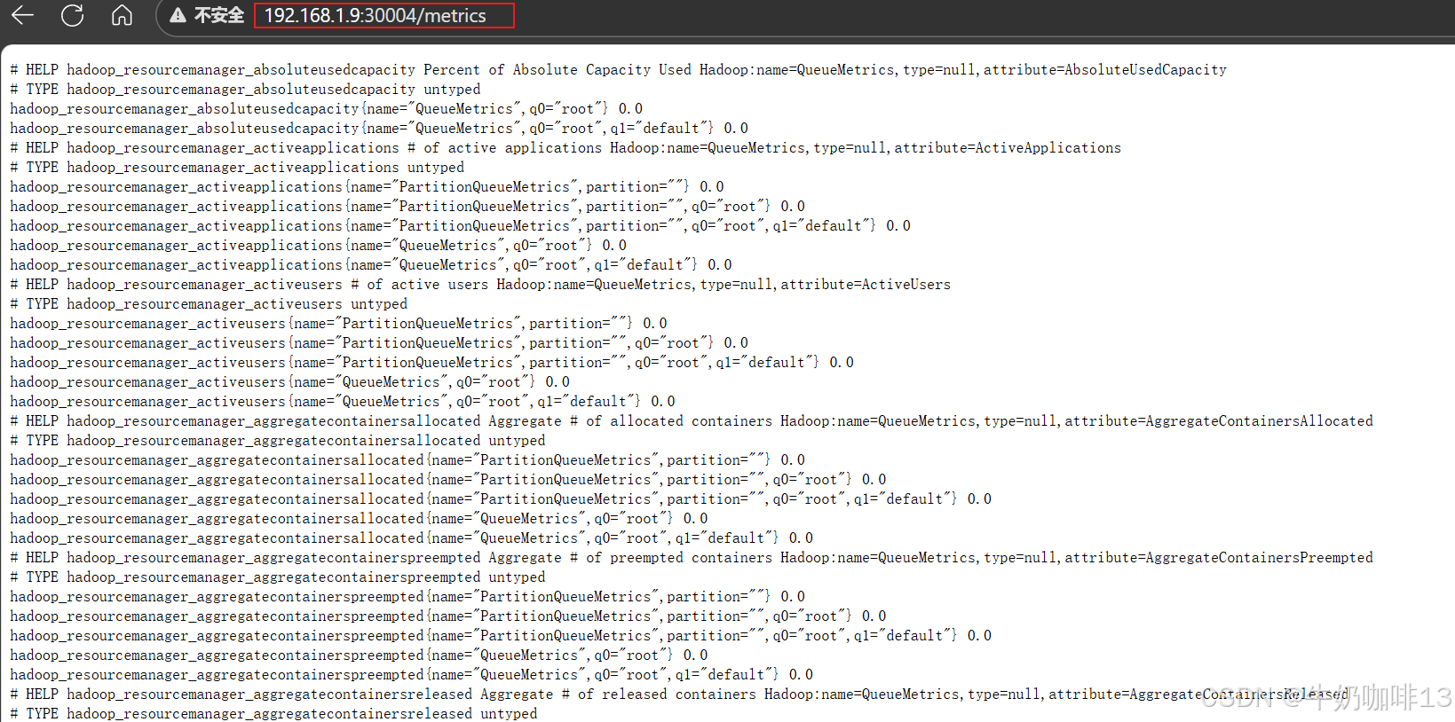 prometheus监控hadoop,其实是通过http方式访问hadoop namenode、resourcemanager、datanode、nodemanager的web页面端口获取监控数据,本文的namenode地址为192.168.1.9(Almalinux9),端口为9870, resourcemanager地址为192.168.1.9,端口为8088,因此获取数据的地址如下(但由于这些界面输出的结果都是json格式数据,prometheus无法识别这些数据,因此要借助【jmx-exporter】来实现数据格式的转换):