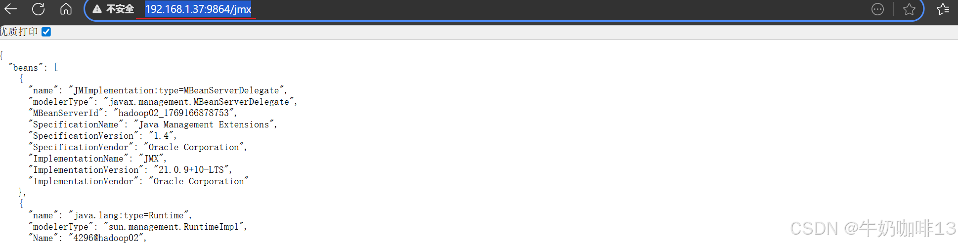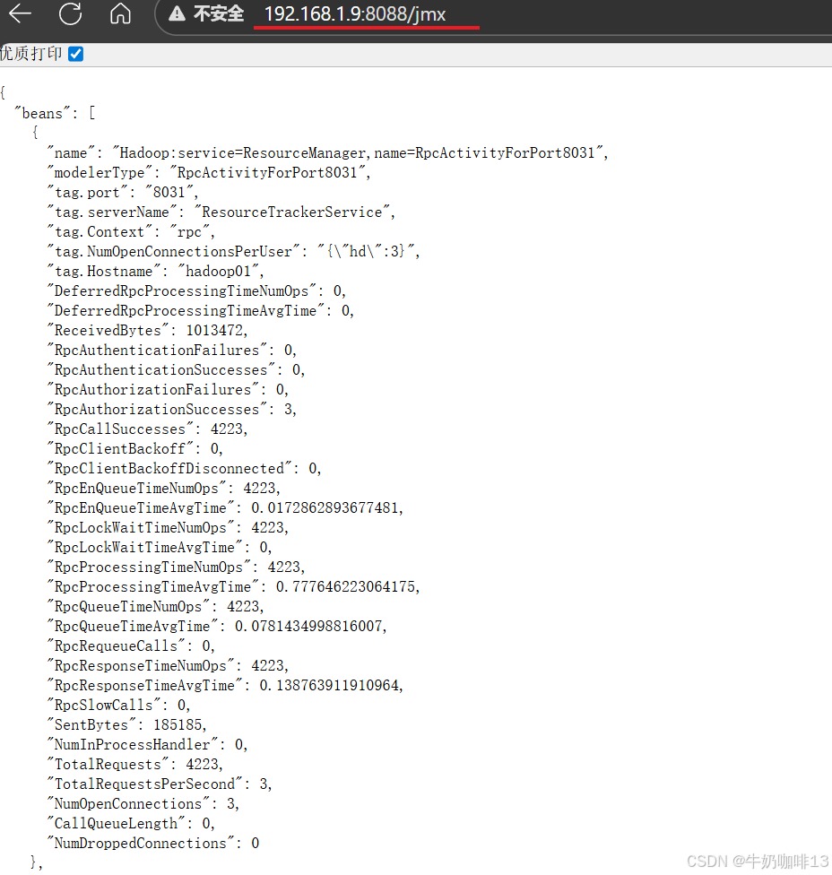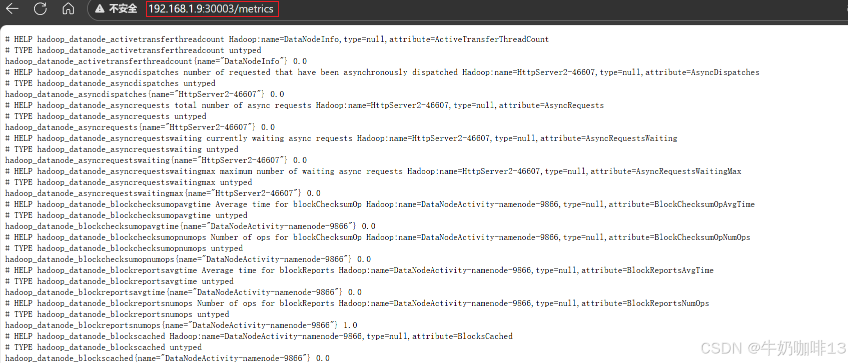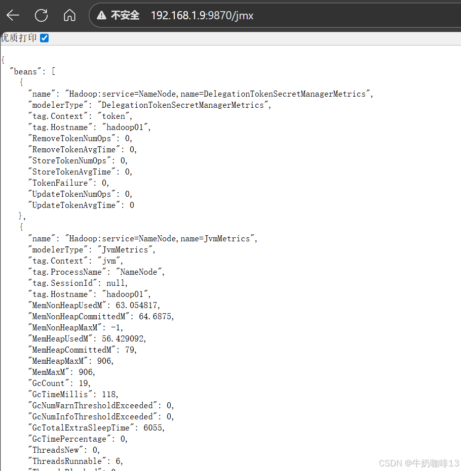 prometheus监控hadoop,其实是通过http方式访问hadoop namenode、resourcemanager、datanode、nodemanager的web页面端口获取监控数据,本文的namenode地址为192.168.1.9(Almalinux9),端口为9870, resourcemanager地址为192.168.1.9,端口为8088,因此获取数据的地址如下(但由于这些界面输出的结果都是json格式数据,prometheus无法识别这些数据,因此要借助【jmx-exporter】来实现数据格式的转换):