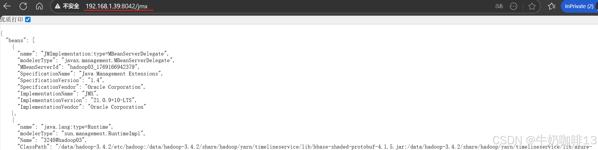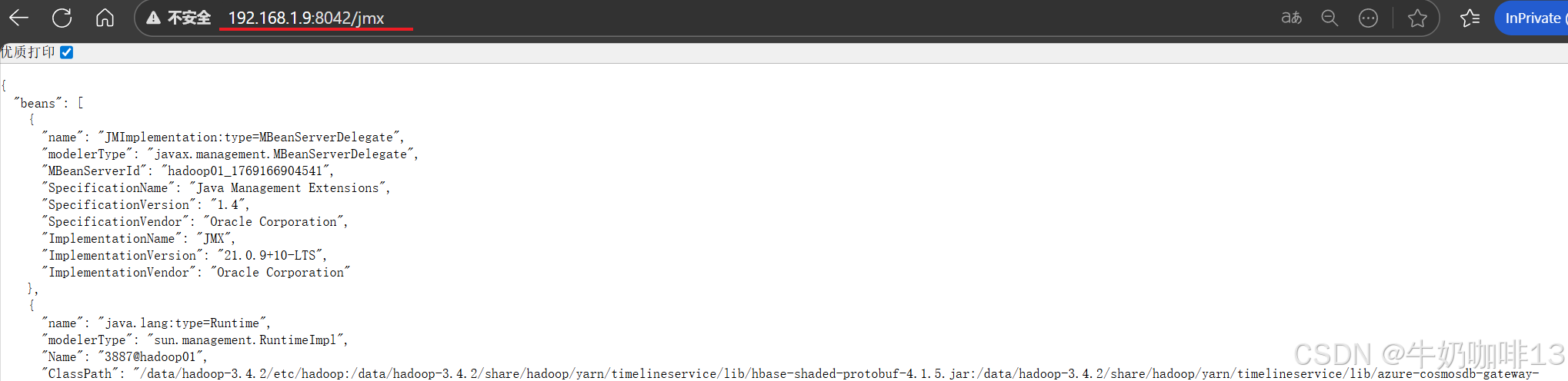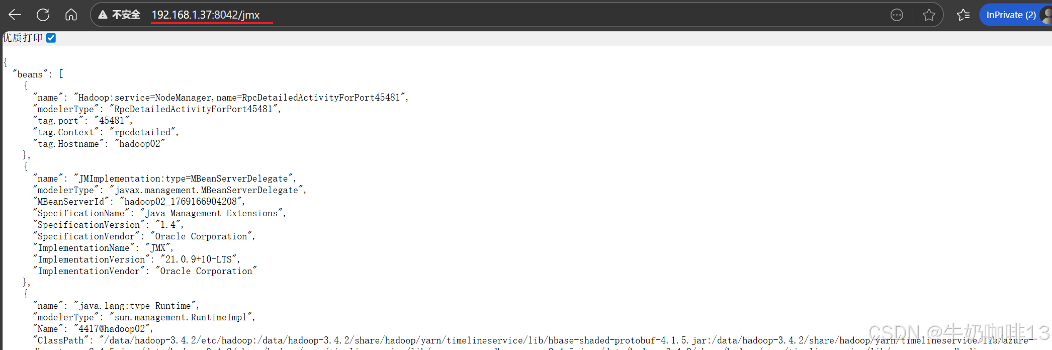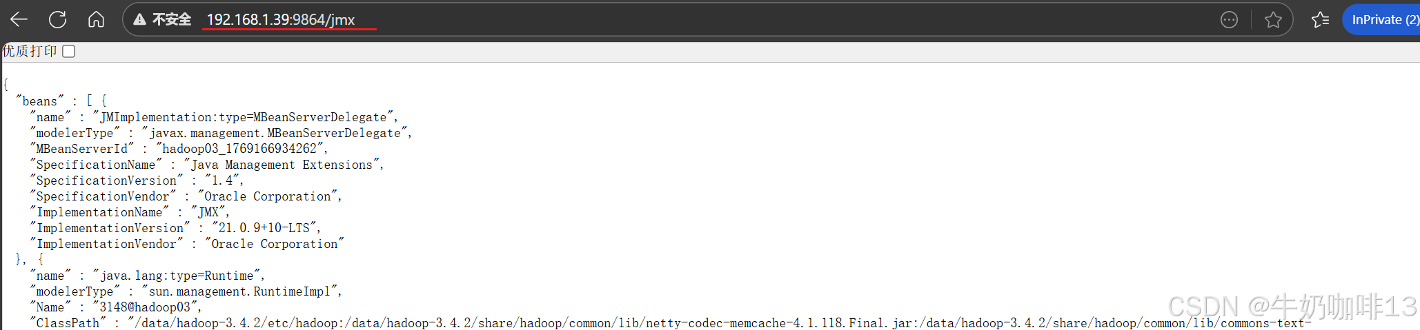 prometheus监控hadoop,其实是通过http方式访问hadoop namenode、resourcemanager、datanode、nodemanager的web页面端口获取监控数据,本文的namenode地址为192.168.1.9(Almalinux9),端口为9870, resourcemanager地址为192.168.1.9,端口为8088,因此获取数据的地址如下(但由于这些界面输出的结果都是json格式数据,prometheus无法识别这些数据,因此要借助【jmx-exporter】来实现数据格式的转换):