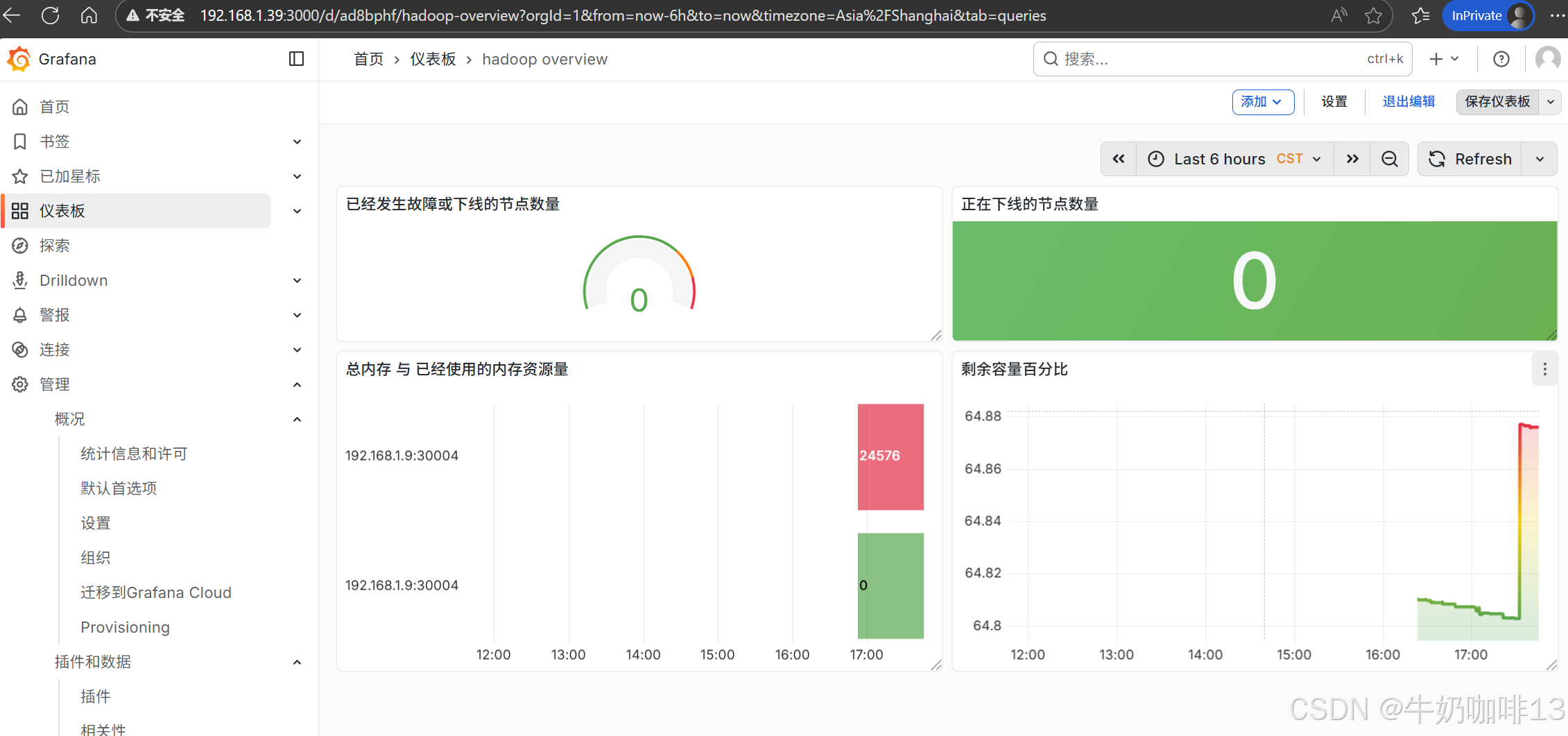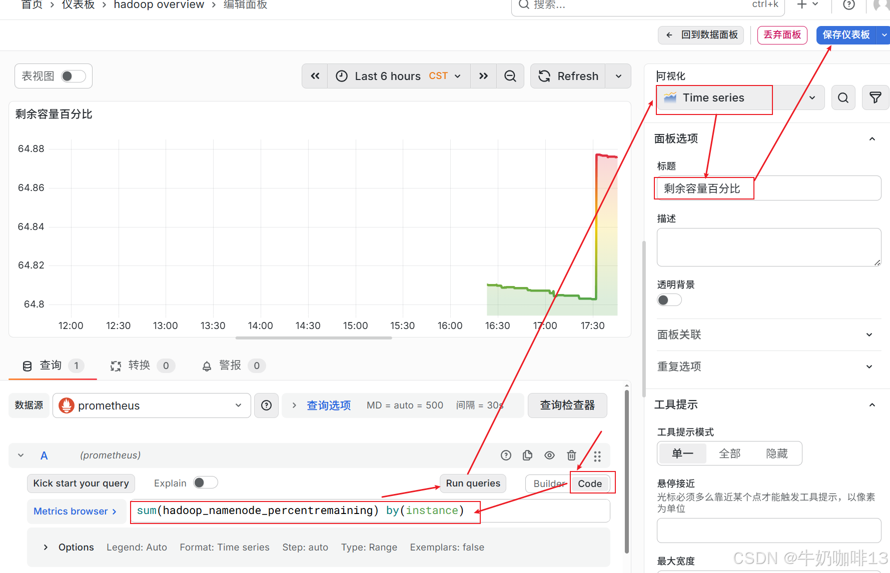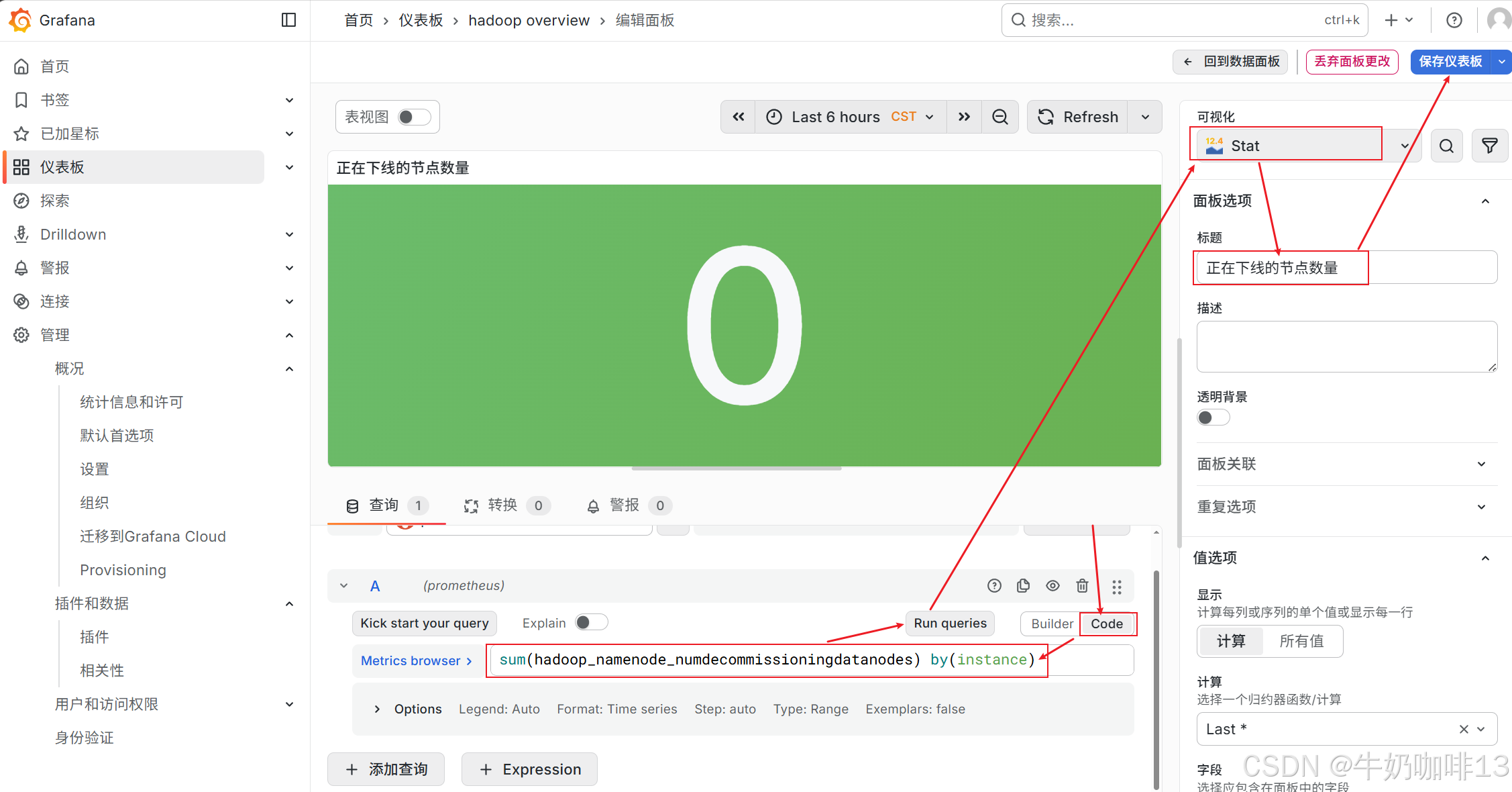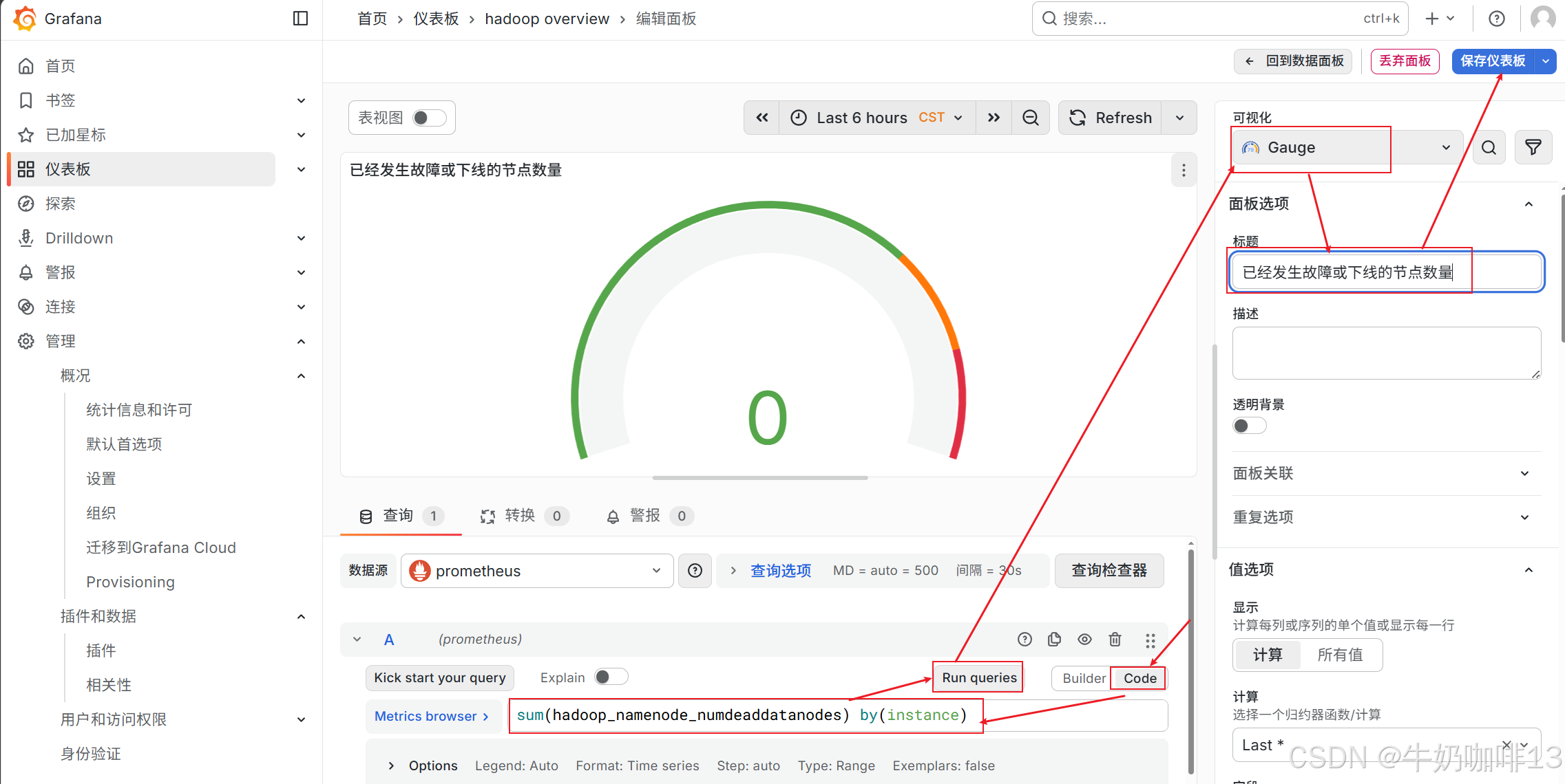 《2》比如我这里实现统计【已经发生故障或已经下线的节点数量】的PromQL语句为【sum(hadoop_namenode_numdeaddatanodes) by(instance)】可将这个语句先到prometheus的query命令行里查询,然后在将这个语句复制到Grafana的新建仪表板中,详细操作如下: