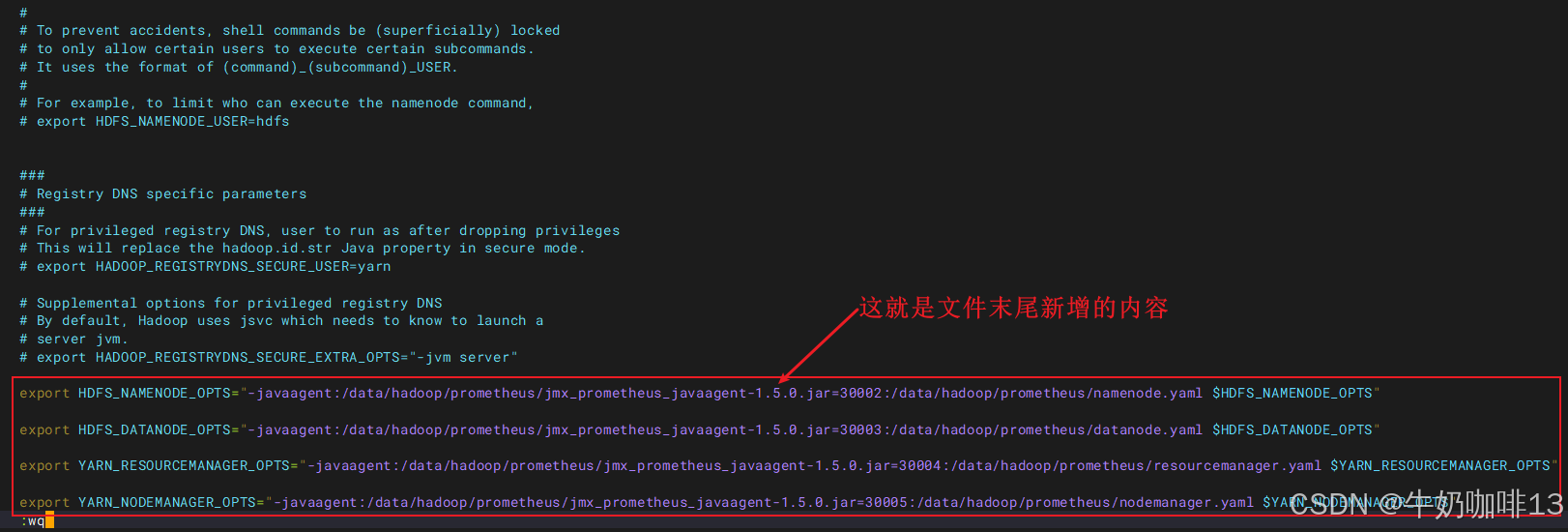 export HDFS_NAMENODE_OPTS="-javaagent:/data/hadoop/prometheus/jmx_prometheus_javaagent-1.5.0.jar=30002:/data/hadoop/prometheus/namenode.yaml $HDFS_NAMENODE_OPTS"