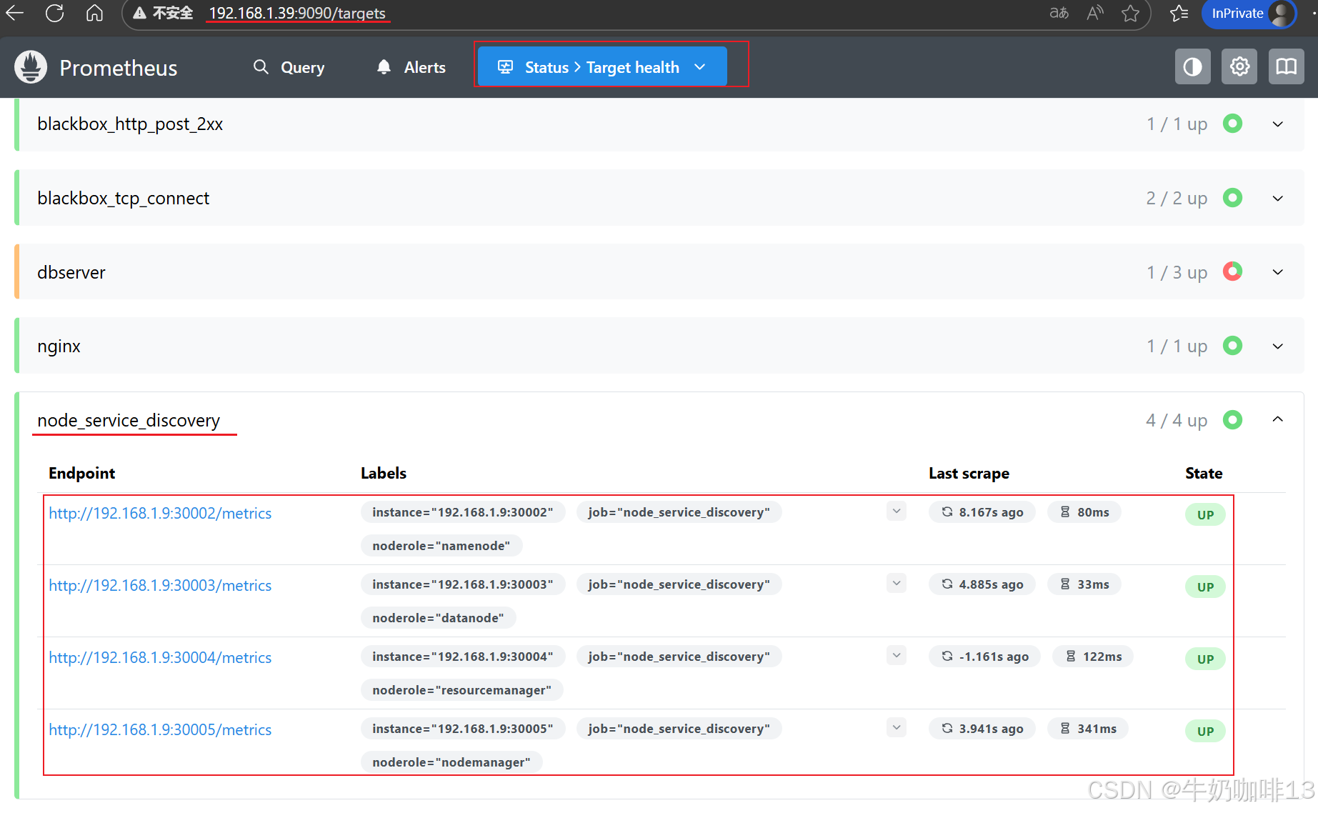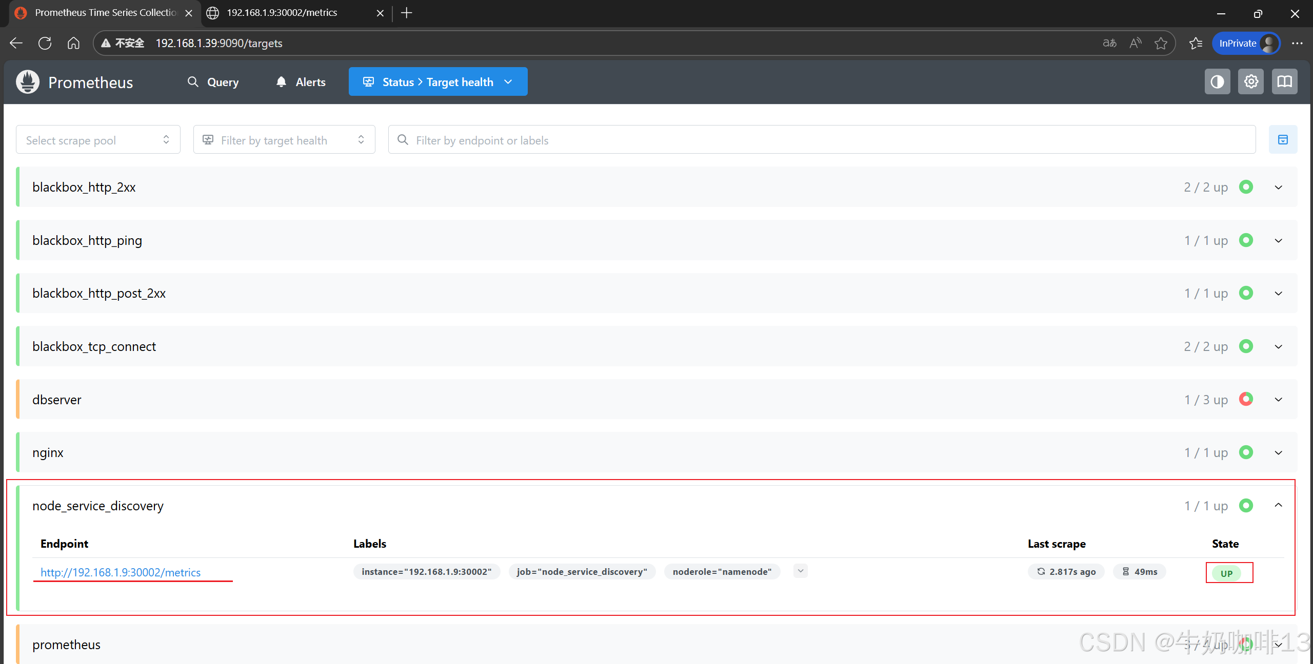 #4.2-然后打开浏览器进入Prometheus Server的Web界面【IP:9090】查看【Status-->Target health】即可看到【node_service_discovery】job_name下添加的这个节点内容(如:192.168.1.9:30002)