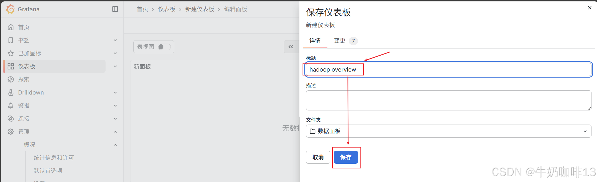 《1》点击【仪表盘】-->【新建】-->【新建仪表板】-->【添加可视化】界面选择【数据源(prometheus)】后点击【保存仪表板】(输入名称【hadoop overview】)。