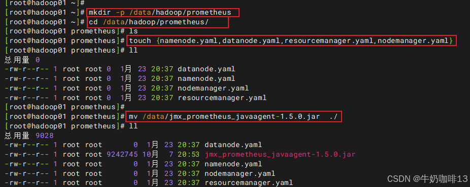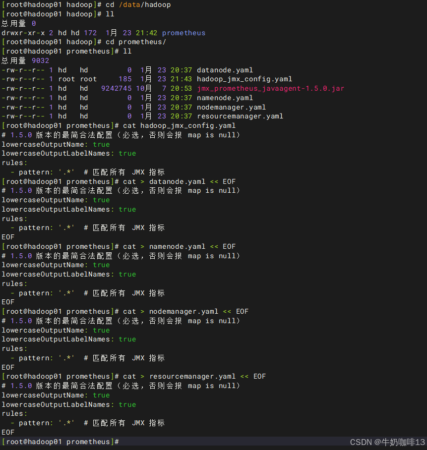 对hadoop监控,需要对namenode、resourcemanager、datanode、nodemanager、historyserver、journalnode、zkfc等基础组件进行监控,若hadoop还集成有spark、hbase、hive、kafka等,也需要对这些组件进行监控。操作方法基本一样(首先,需要创建每个组件的配置文件,启动jmx_exporter的时候需要指定配置文件,配置文件可以为空,但不能没有。因此,需要为每个组件创建一下配置文件,暂时设置为空就好。接着,修改hadoop的hadoop-env.sh文件)。
