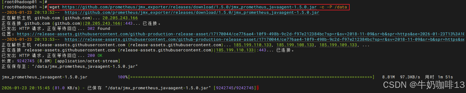 wget https://github.com/prometheus/jmx_exporter/releases/download/1.5.0/jmx_prometheus_javaagent-1.5.0.jar -c -P /data