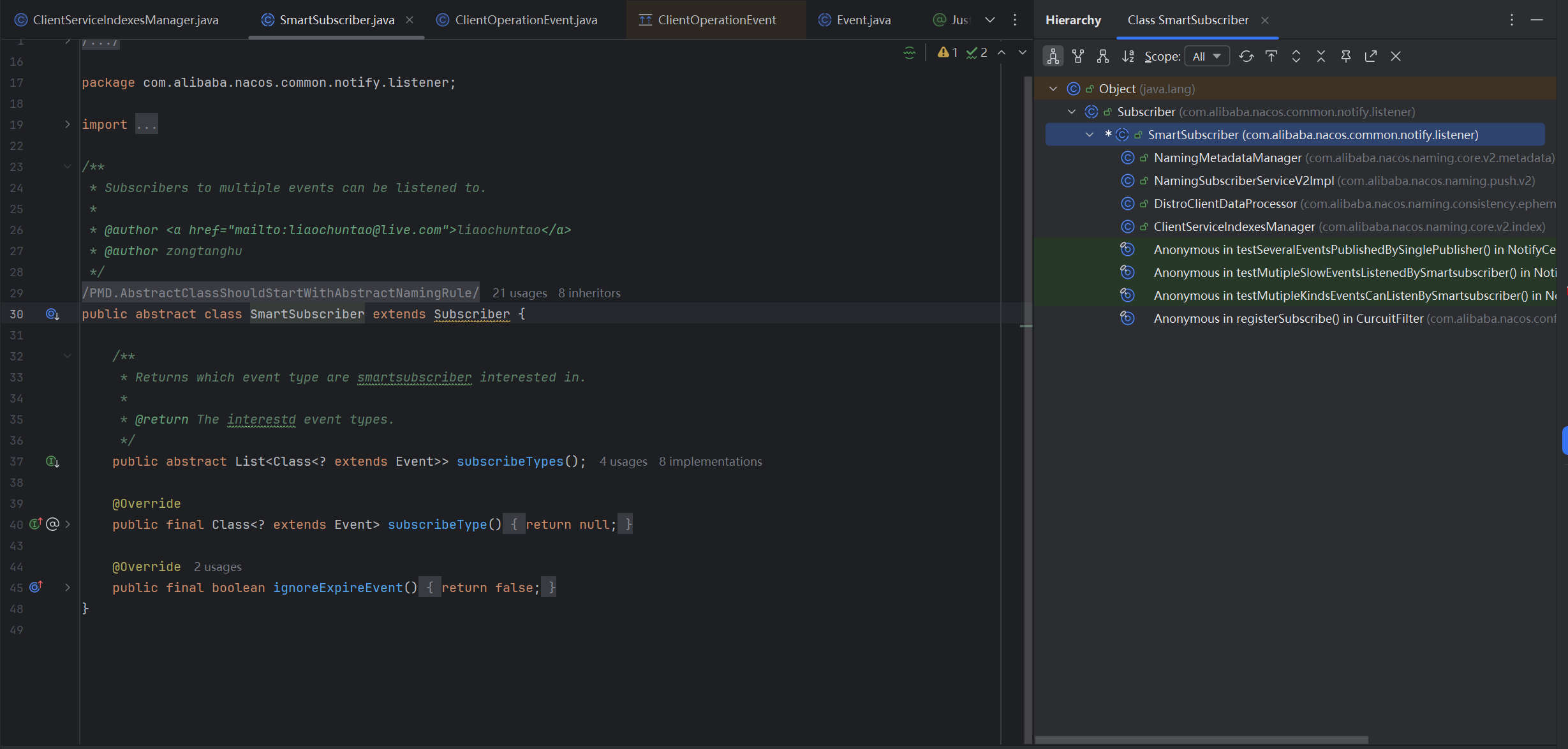 同样的,我们再去看一下所有的Handler所在类,也可以发现,有些继承自**SmartSubscriber**,并且SmartSubscriber之上还有个顶级接口Subscriber,就是订阅者,在这里定义了顶级抽象方法