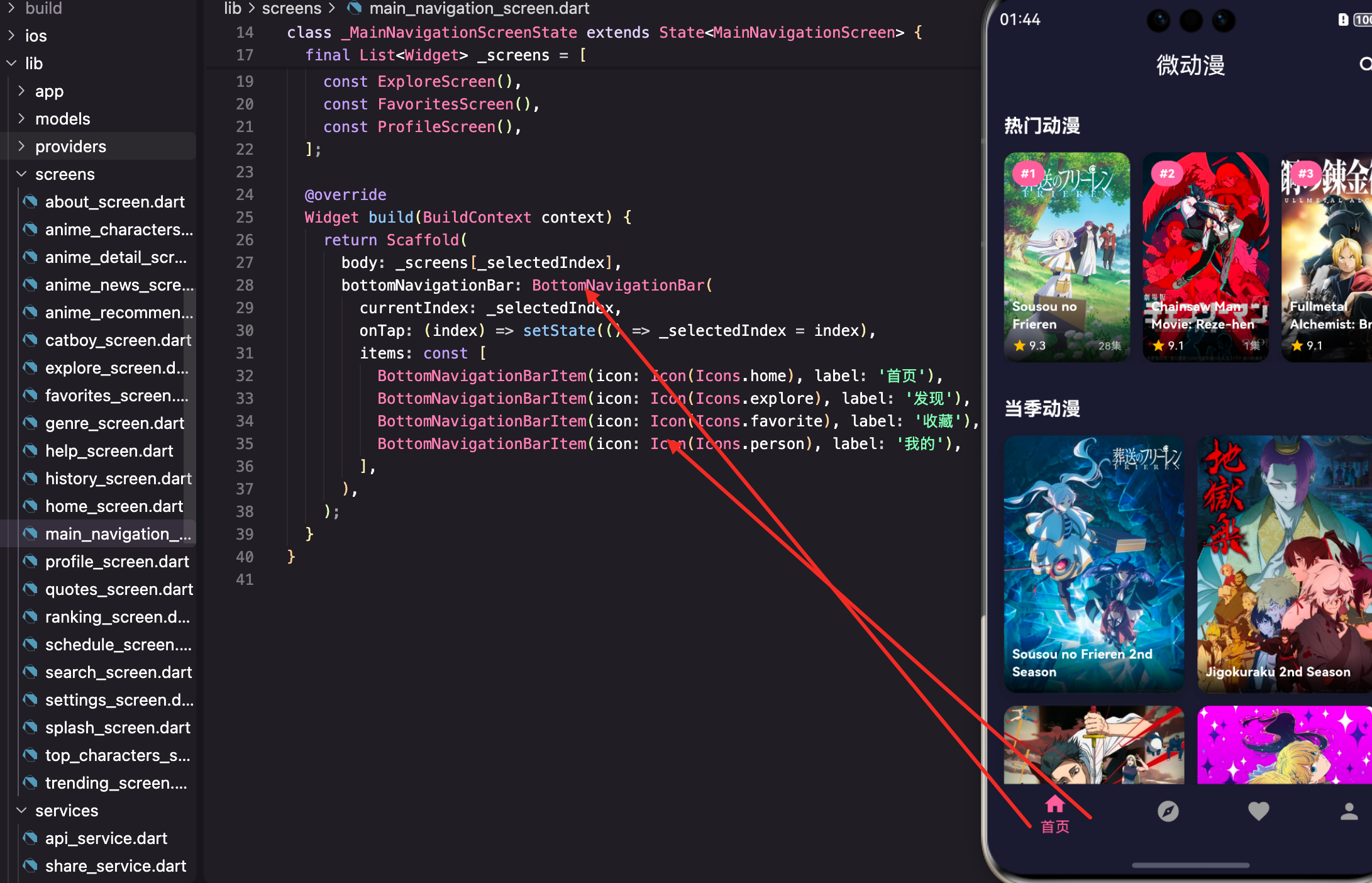 body 显示当前选中的页面,通过索引从 _screens 列表获取。