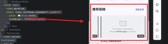 Column进行垂直布局,包含标题栏和视频列表。 Row中的TextButton提供"查看全部"功能,便于用户跳转到视频列表页。ListView.builder支持水平滚动,动态生成推荐视频卡片,提高性能。