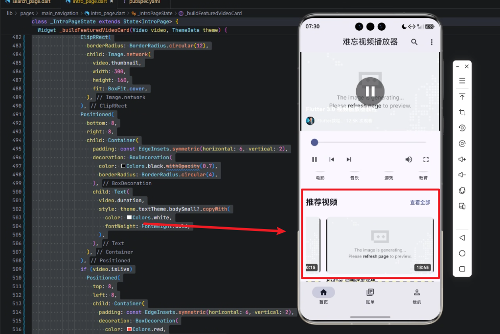 _buildFeaturedVideos和_buildFeaturedVideoCard两个方法,便于维护和复用。 - 视觉优先:通过圆角、阴影和文字叠加,提升视频模块的视觉吸引力。