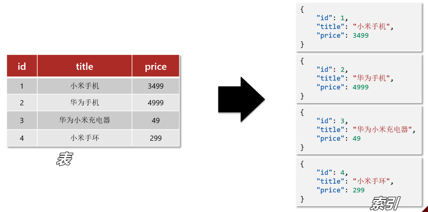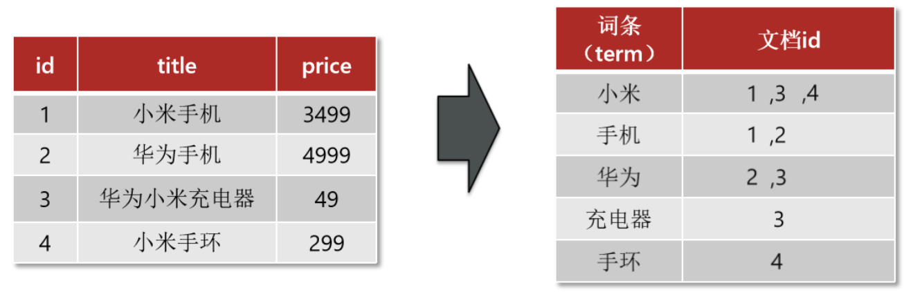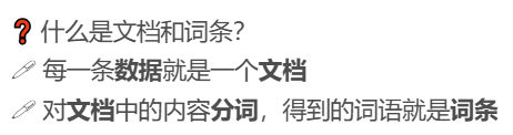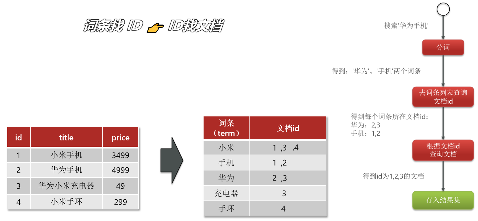 🖊 对文档内容分词,对词条创建索引,并记录词条所在文档的id。查询时先根据词条查询到文档id,而后根据文档id查询文档
