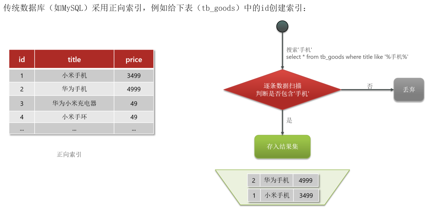🖊 基于文档id创建索引。根据id查询快,但是查询词条时必须先找到文档,而后判断是否包含词条