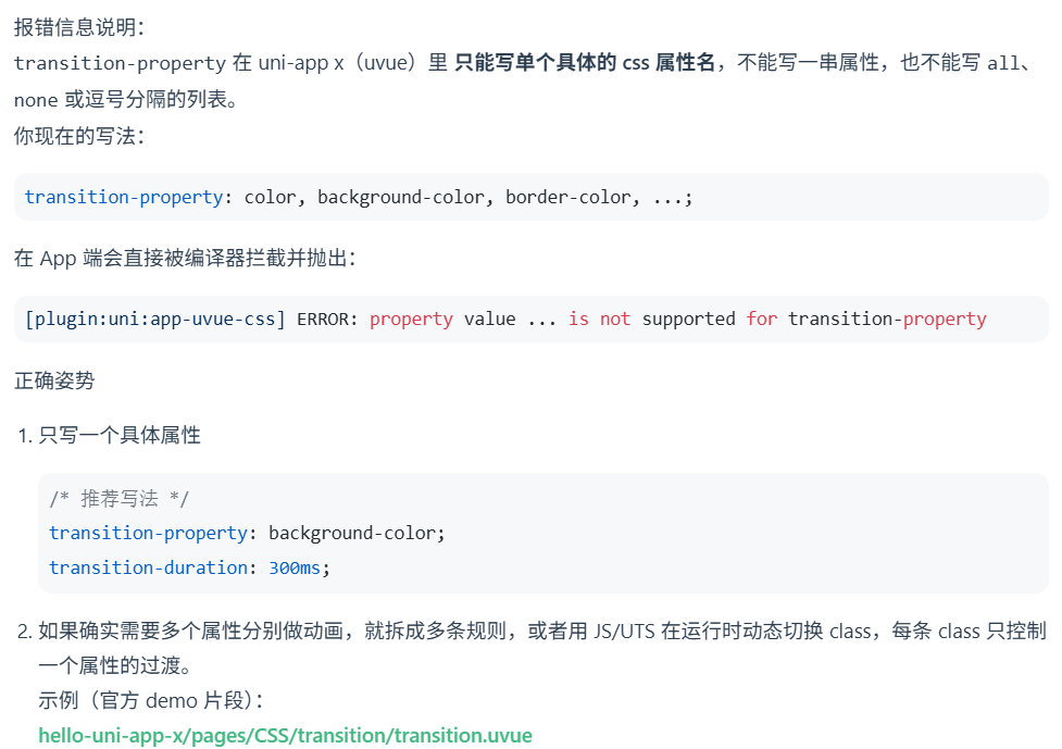 plugin:uni:app-uvue-css\] ERROR: property value `color, background-color, border-color, text-decoration-color, fill, stroke, opacity, box-shadow, transform, filter, backdrop-filter` is not supported for `transition-property` (supported values are: `css property`) 这个问题不知道是为什么transition的文档上也灭有讲, 解决方法如下