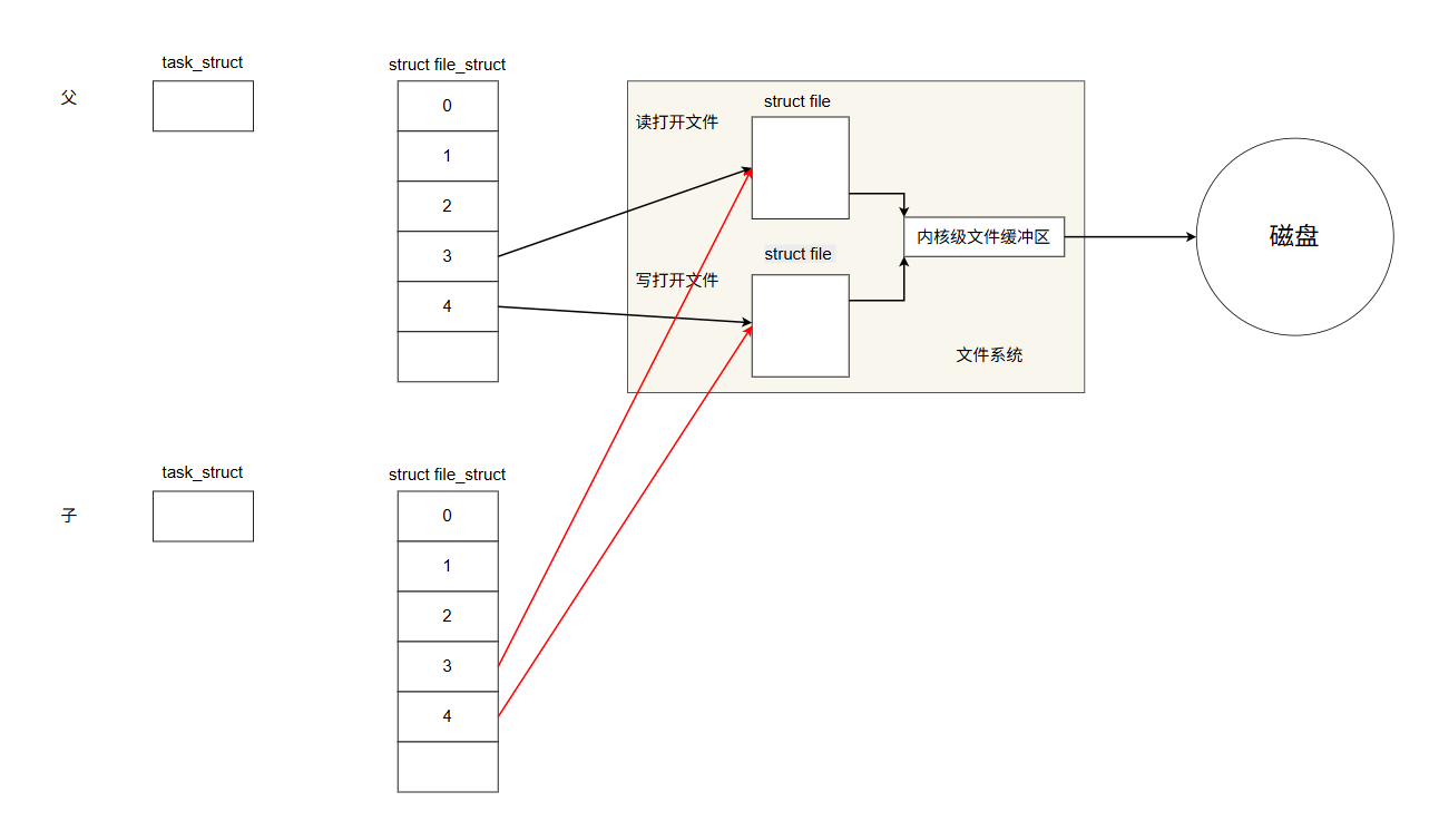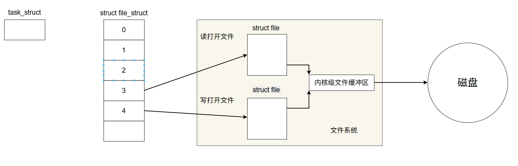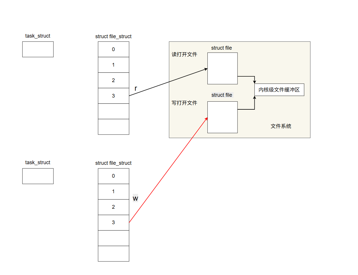 如上图,一个进程以不同方式打开同一个文件,即读和写,该进程的struct file_struct会分别添加读和写的文件描述符(fd),但两个文件指向的内核级缓冲区相同。