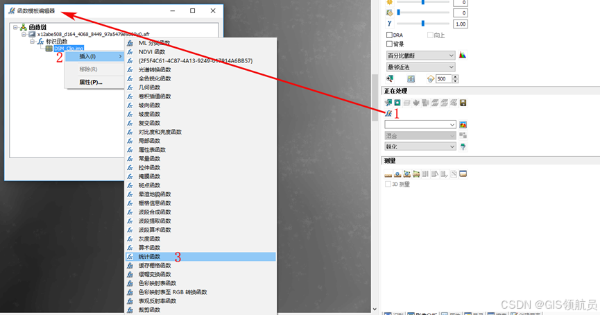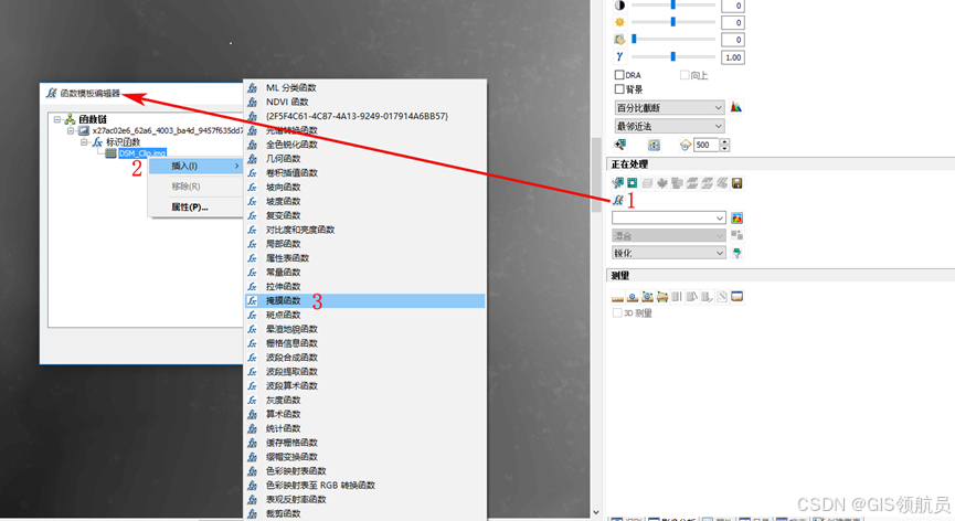 在影像分析窗口选中样例数据,即DSM_Clip.img。点击1处进入函数模板编辑器,点击2处右键---插入---掩膜函数。
