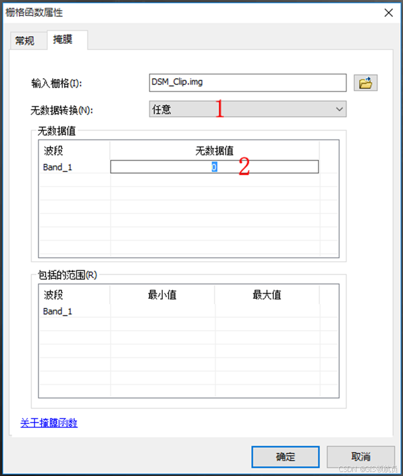 在弹出的栅格函数属性中,点击1处设置位任意,点击2处输入0,如果是多波段,则每个波段都输入0。