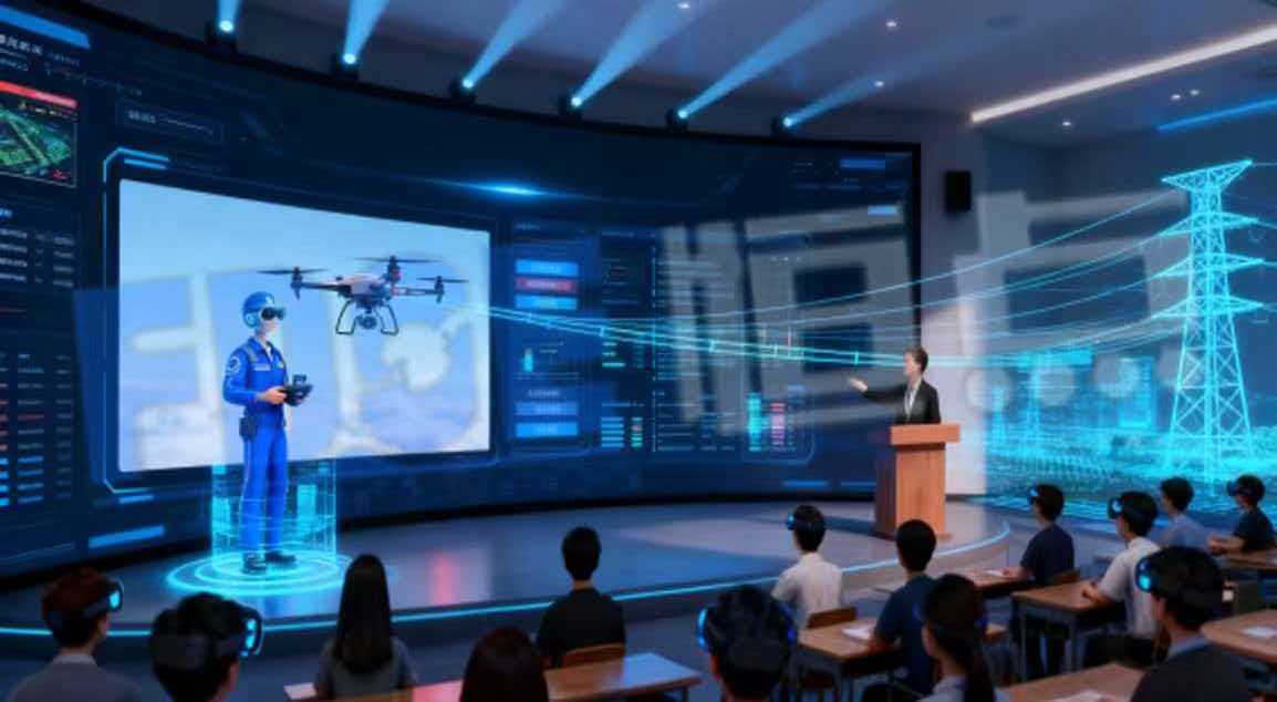 "真实教师+虚拟教师"双师孪生课堂的新教学模式,深度融合无人机电力巡检专业教学场景,破解"理论"与"实践"教学脱节的难题。