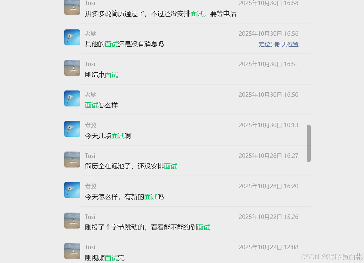 我是九月底正式离职,十月开始投简历面试,一直到十一月底才确定 offer。期间主动发起沟通上百个,已读不回占大部分,投了三十多个岗位,进入简历评估的有十多家,安排面试的有九家,其中五家进入到最后的 HR 面,三家走完面试流程启动了背调,由于最后着急确定 offer,有些也没继续推进了。