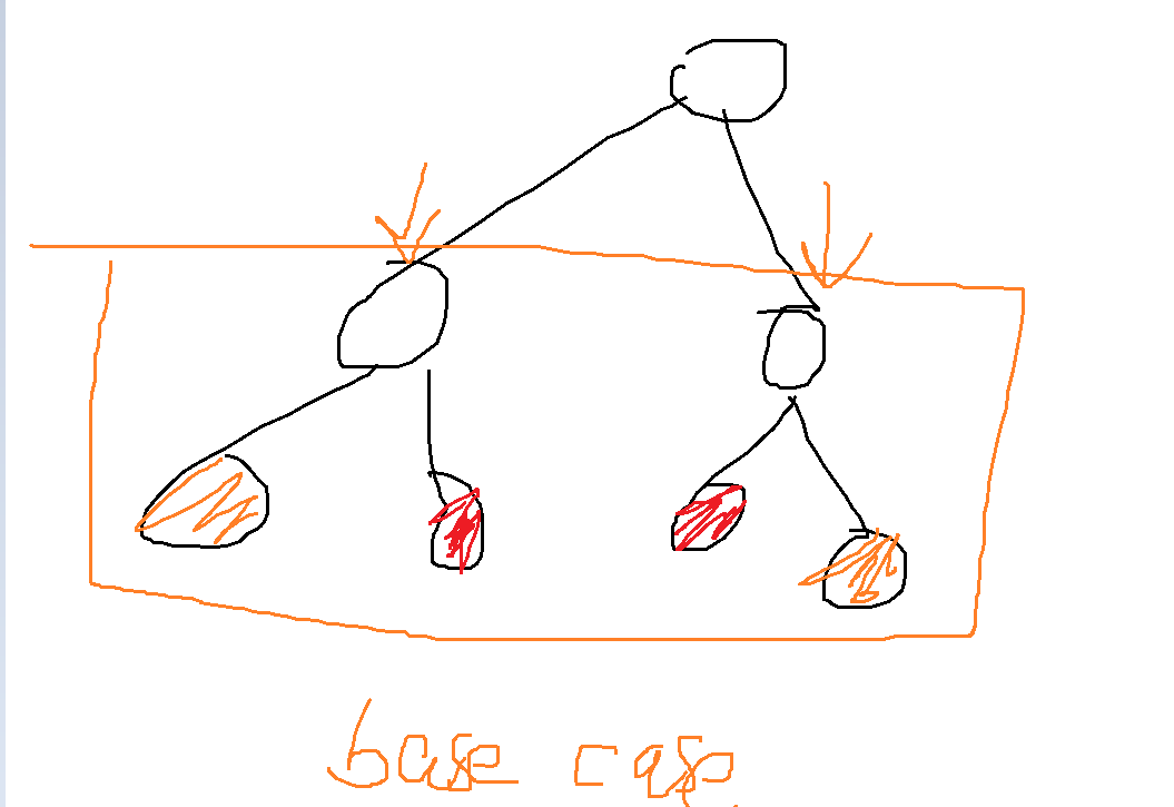 递归入口是两个节点,因此我们重新写一个函数进行递归,参数有两个节点,对根的左子树和右子树进行递归,画basecase的时候记得要画有两个节点可以进入递归的情况,如图