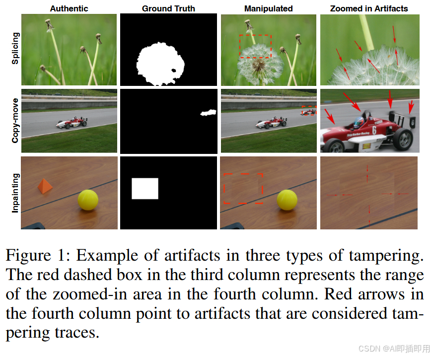 - 微观视角(结合 Figure 1) :图1展示了拼接(Splicing)、复制移动(Copy-move)和修复(Inpainting)。红色箭头指向的区域存在细微的像素级伪影(Artifacts)。这说明微观特征对于发现"哪里不对劲"至关重要。