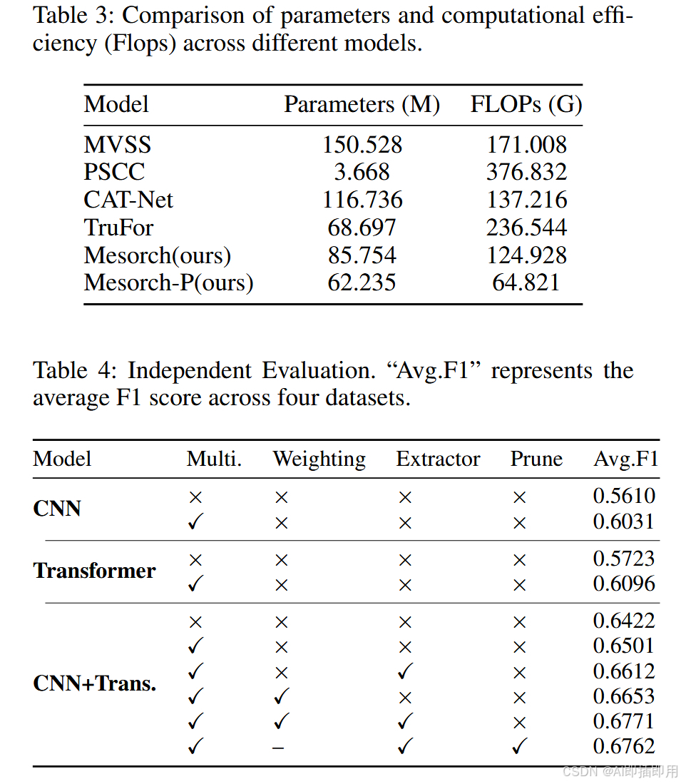 - 剪枝的威力 :Mesorch-P(剪枝版)的 FLOPs 仅为 64.8 G,不到 MVSS-Net (171 G) 的一半,更是远低于 PSCC-Net (376 G)。参数量也得到了有效控制。这证明了其作为高效 Baseline 的潜力。