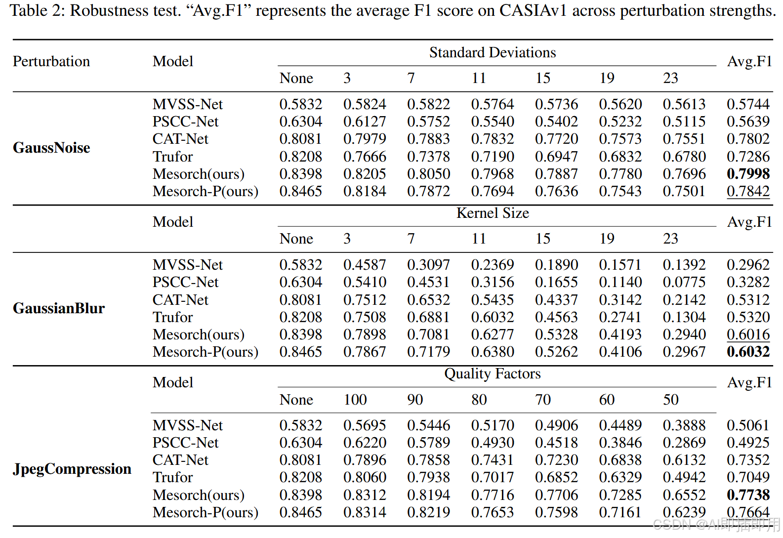 - 在面对高斯噪声、高斯模糊和 JPEG 压缩攻击时,Mesorch 展现出了极强的稳定性,性能下降幅度远小于对比模型。