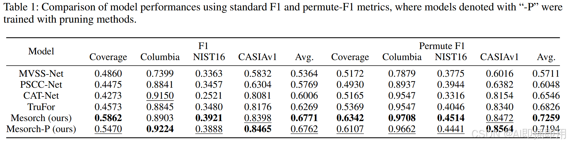 - 在 CASIAv1, Coverage, NIST16, Columbia 四大经典数据集上,Mesorch(特别是剪枝版 Mesorch-P)的 F1 分数均达到或接近最优。