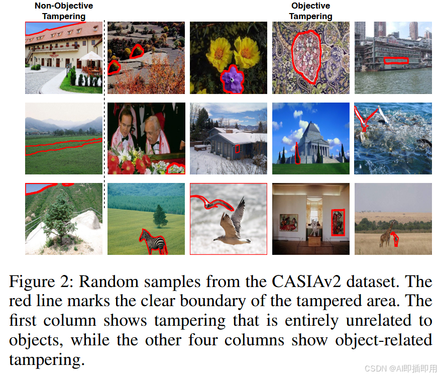 - 宏观视角(结合 Figure 2) :图2展示了随机抽样的篡改图像。红线勾勒出的区域大多是完整的物体 (如动物、人)。这说明篡改往往是"面向对象"的,宏观语义对于定位"哪个物体被改了"至关重要。