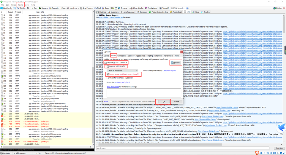 Tools->options->HTTPS->capture https connects->decrypt https traffic->ignore server certificate errors(unsafe)->actions->trust root certificate->确定->OK