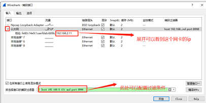 l 第二种,启动wireshark后,点击捕获--->>选项。在弹出框中选择网卡以及配置过滤条件。