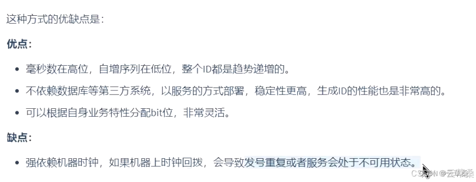 缺点:强依赖机器时钟,如果机器上时钟回拨,会导致发号重复或者服务会处于不可用状态。