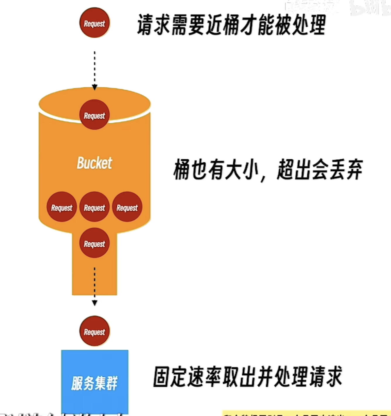 漏桶是请求进入桶中排队,系统以固定速率从桶底"漏水"(处理请求)