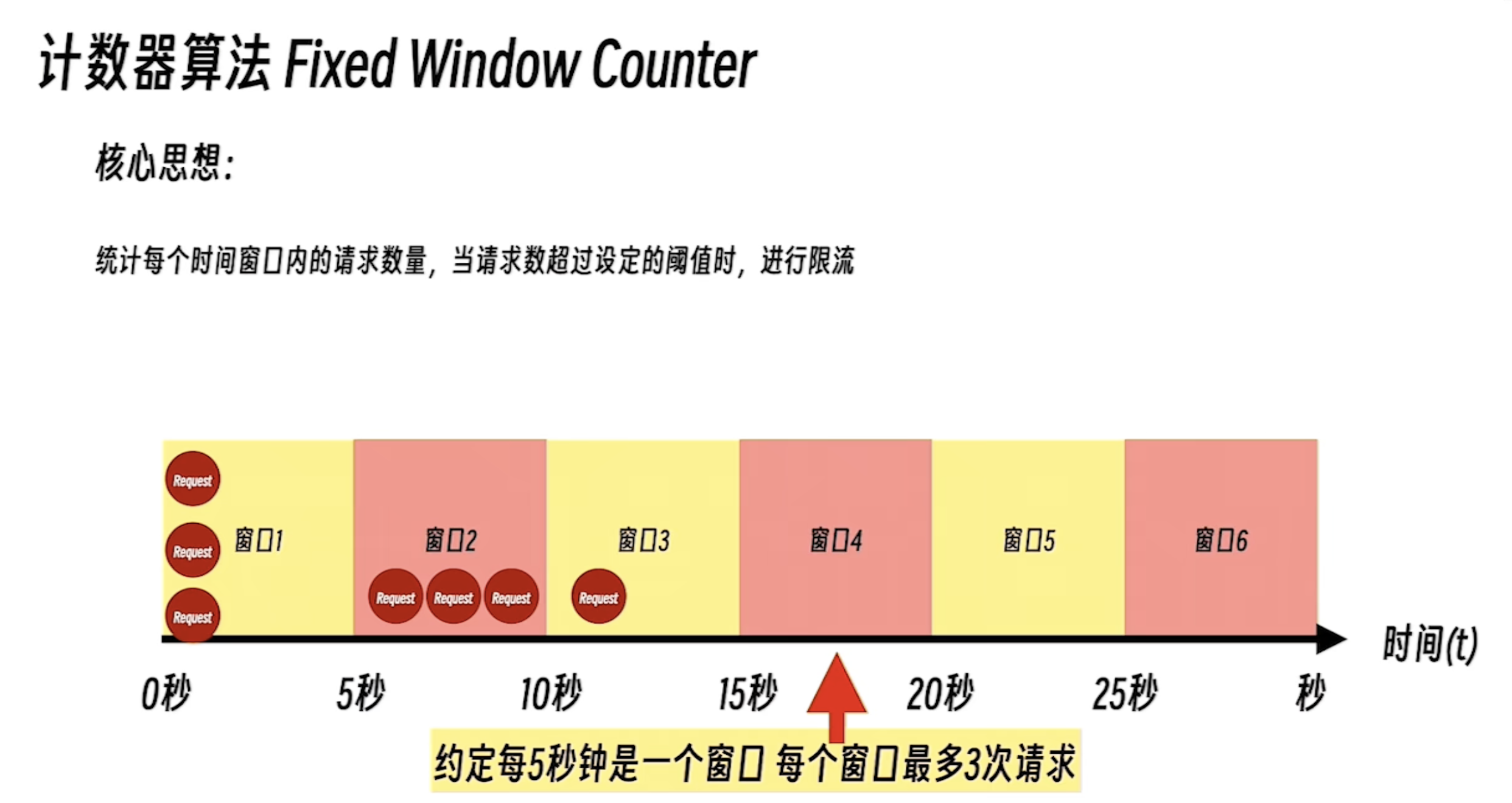 固定窗口算法将时间划分为固定长度的时间窗口(如 1 秒、1 分钟),在每个窗口内统计请求次数。如果请求数超过预设阈值,则拒绝后续请求,直到进入下一个窗口。