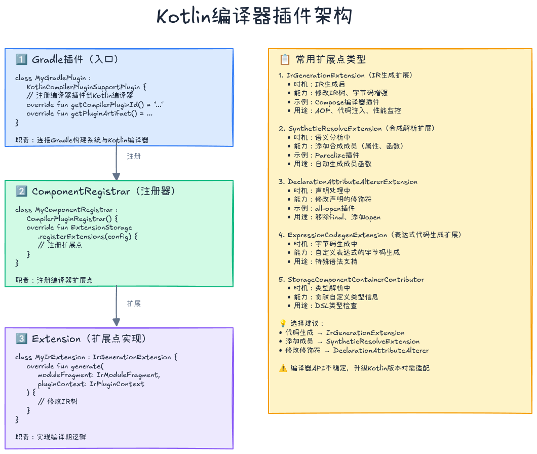 | IR生成后 | 编译器插件(后端) | 修改字节码逻辑 | Compose编译器插件 |