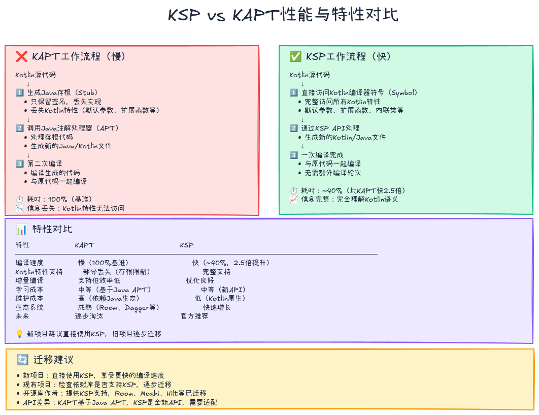 KAPT(Kotlin Annotation Processing Tool)基于Java的APT(Annotation Processing Tool),需要将Kotlin代码转换为Java存根(stub),效率较低。KSP(Kotlin Symbol Processing)是Kotlin原生的注解处理方案,性能更好。