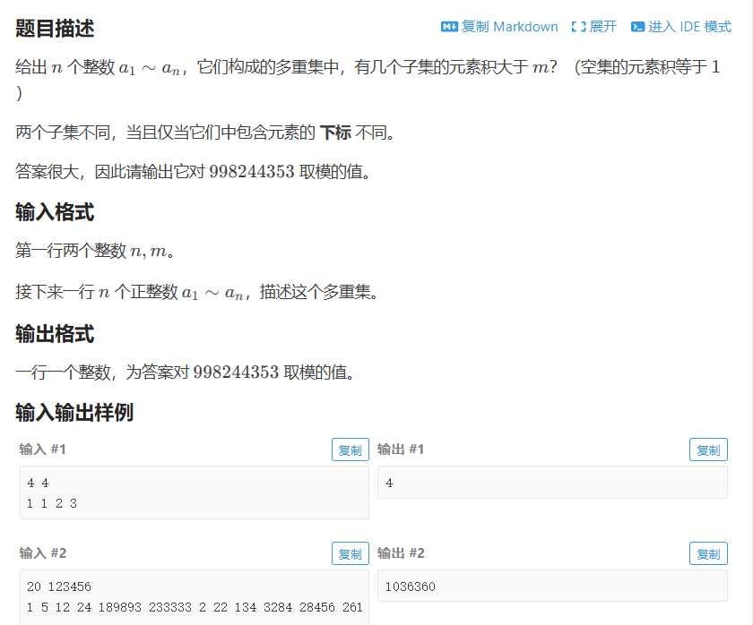 大于m的个数不好用背包,小于等于用背包就好求嘛!正难则反!正难则反!正难则反!