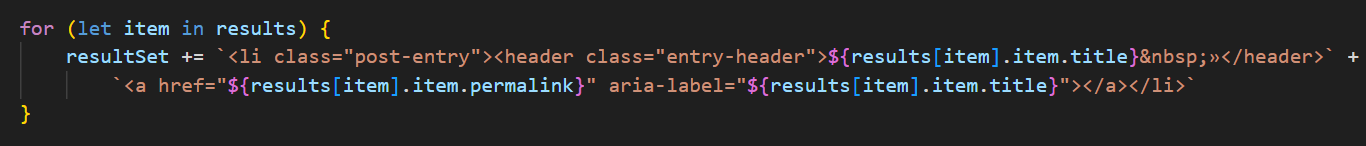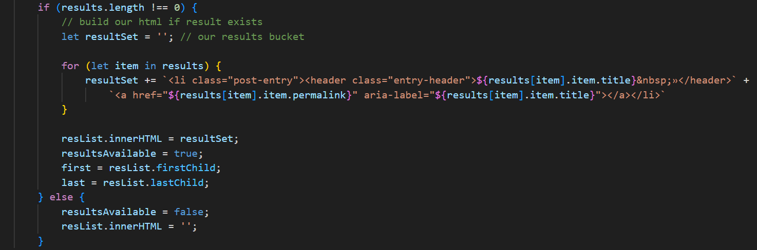 有搜索结果时,就构建 HTML 列表,这里可以看到用 for 循环遍历搜索结果(搜索结果 results 是一个对象数组,每个对象包含 .item 原始数据项),每个结果都会生成一个 <li> 列表项,里面包含标题和指向文章的链接 permalink,搜索结果遍历完成后,将这段动态生成的 HTML 插入到 resList 元素中,resList 就是之前在 search.html 模板里的 searchResults 元素