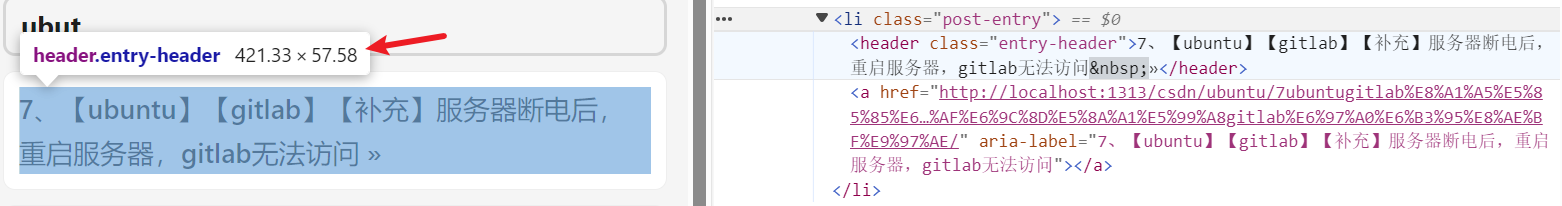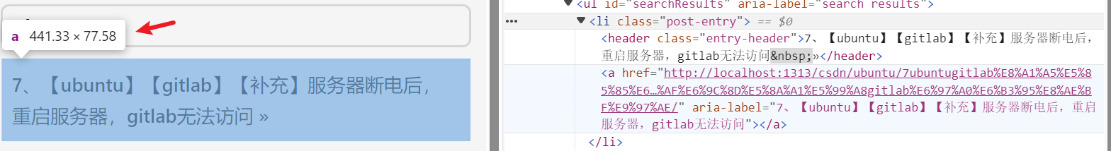 <a> 区域大小则是 441.33 × 77.58 像素大小,可以看到 PaperMod 主题手动将 <a> 区域的给放大了,所以用户能点击跳转过去