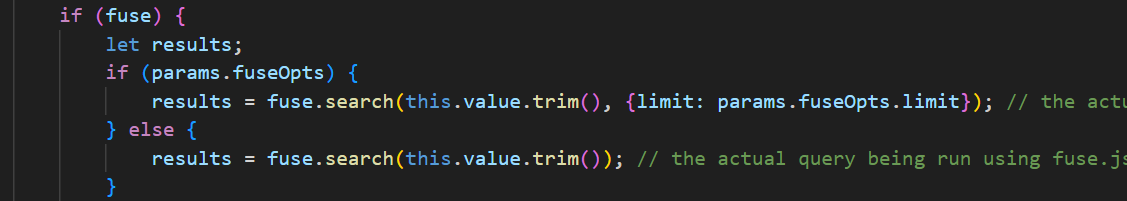 fuse 是前面已经初始化好的 Fuse.js 实例,this.value.trim() 表示获取用户当前输入的内容,并去除收尾空格,然后调用 fuse.search(...) 对数据进行模糊匹配,如果用户有自定义配置 params.fuse.Opts.limit,就限制返回结果数量,比如只显示前面 5 条搜素结果