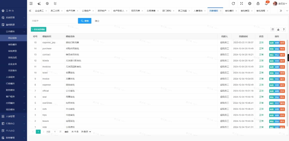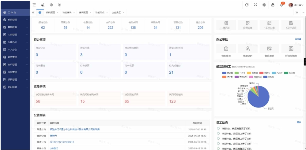 此OA是一款开源的、实用的企业办公系统。集成了系统设置、人事管理、消息管理、审批管理、日常办公、客户管理、合同管理、项目管理、财务管理等模块。系统简约,易于功能扩展,方便二次开发,让开发者更专注于业务深度需求的开发,通过二次开发之后可以用来做CRM,ERP,业务管理等系统。