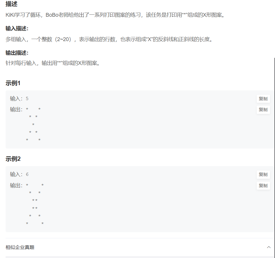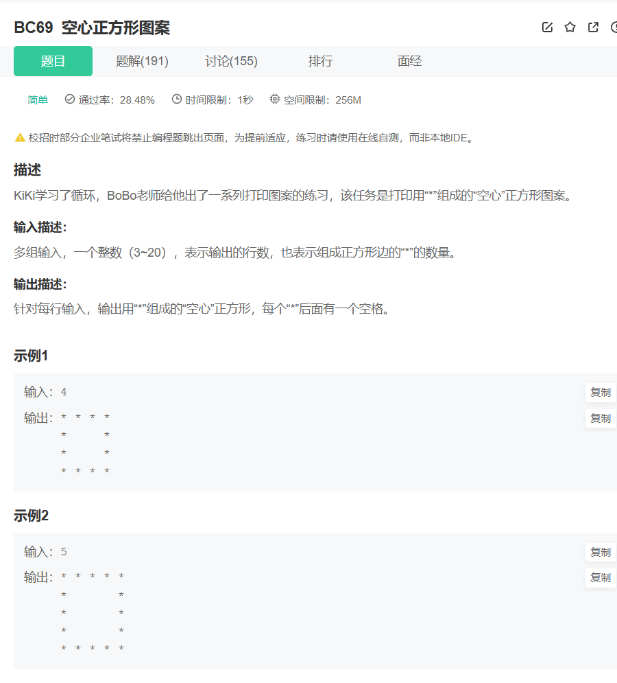 该方法无需数组存储,直接通过双重循环遍历每个位置,实时判断是否为斜线位置,进而打印*或空格。核心优势是代码简洁、无额外内存占用,格式风险极低,是BC68题目的最优解。