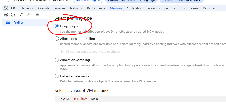 Performance 面板确认泄露后,用 Memory 面板进一步定位 "哪些对象未被回收":