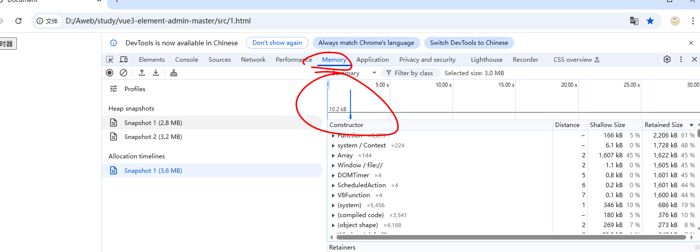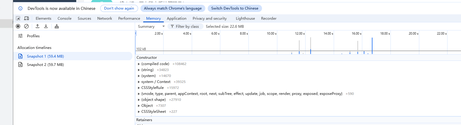 所以此时我们就可以更明确得确认内存泄露的问题是存在的了,,接下来就精准定位问题,可以利用Heap snapshot来定位问题,如图所示: