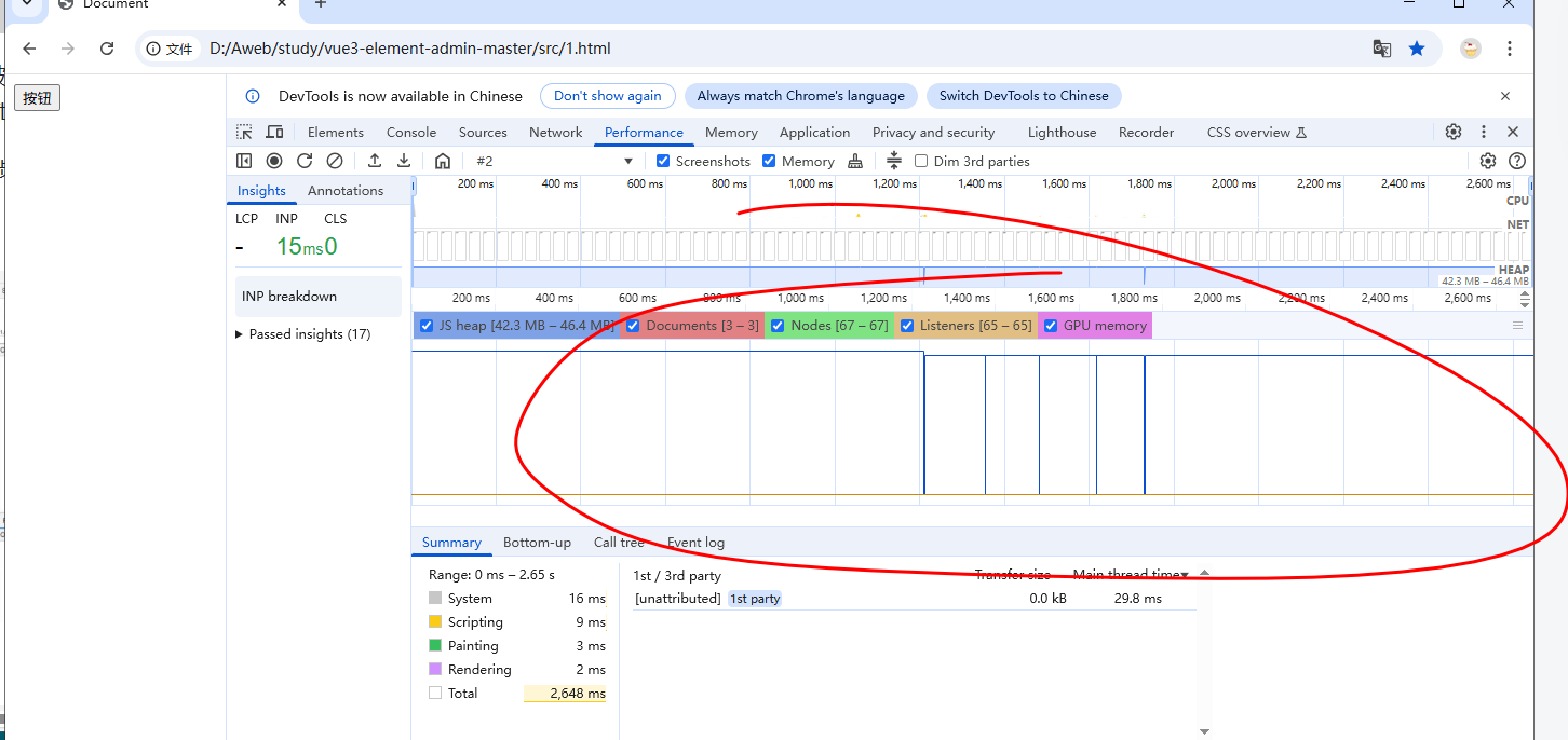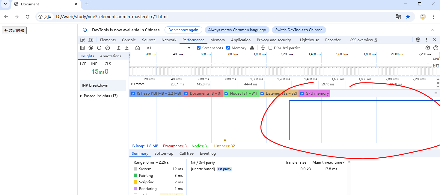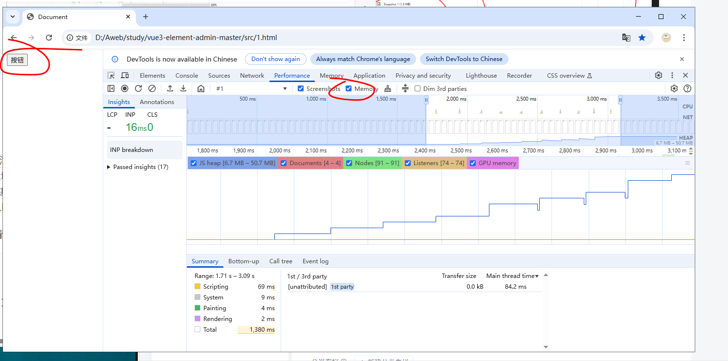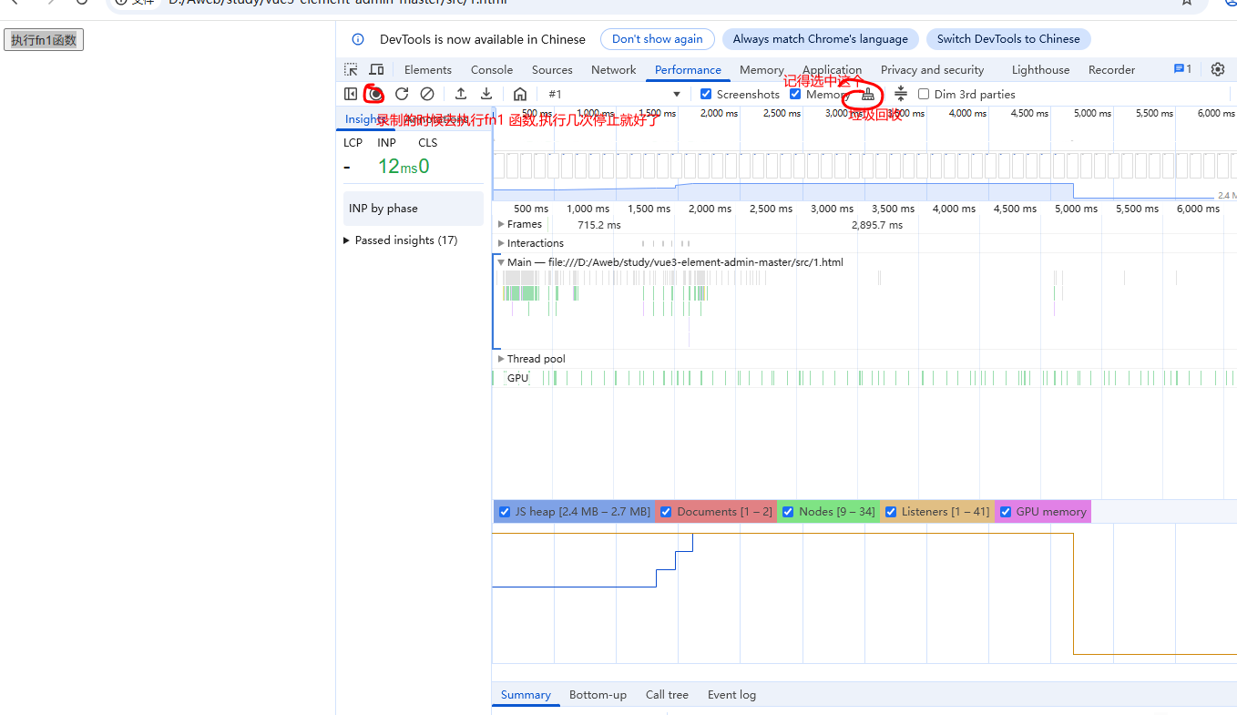 设置了一个按钮,每次执行就会将fn1函数的返回值添加到全局数组变量res中,是为了能在performacne的曲线图中看出效果