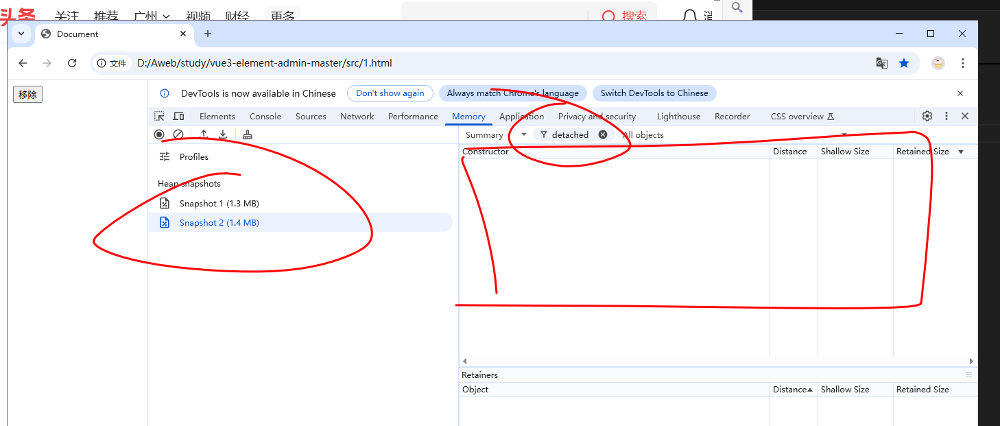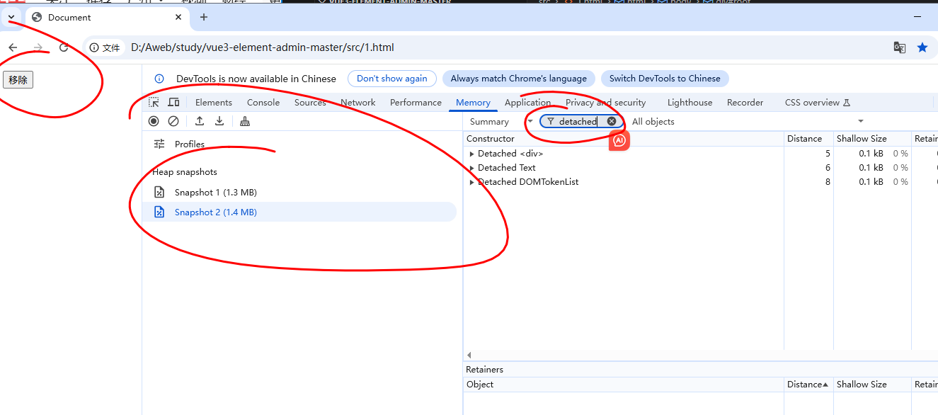 同样的先记录一下初始状态的快照,然后点击移除按钮后,再点击一次快照,此时内存大小我们看不出什么变化,因为移除的节点占用的内存实在太小了可以忽略不计,但我们可以点击第二条快照记录,在筛选框里输入detached,于是就会展示所有脱离了却又未被清除的节点对象