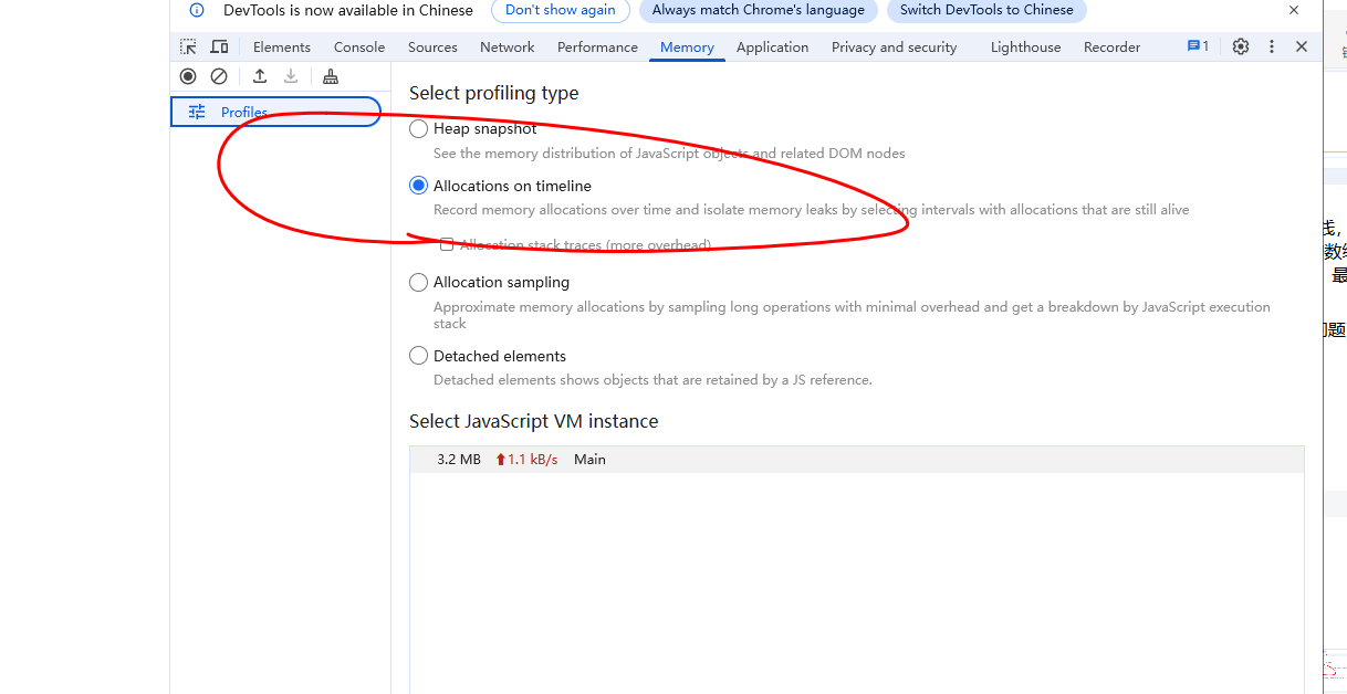 - Allocation sampling(分配采样):低开销的内存采样,适合快速排查大面积泄露,无需精确到单个对象。