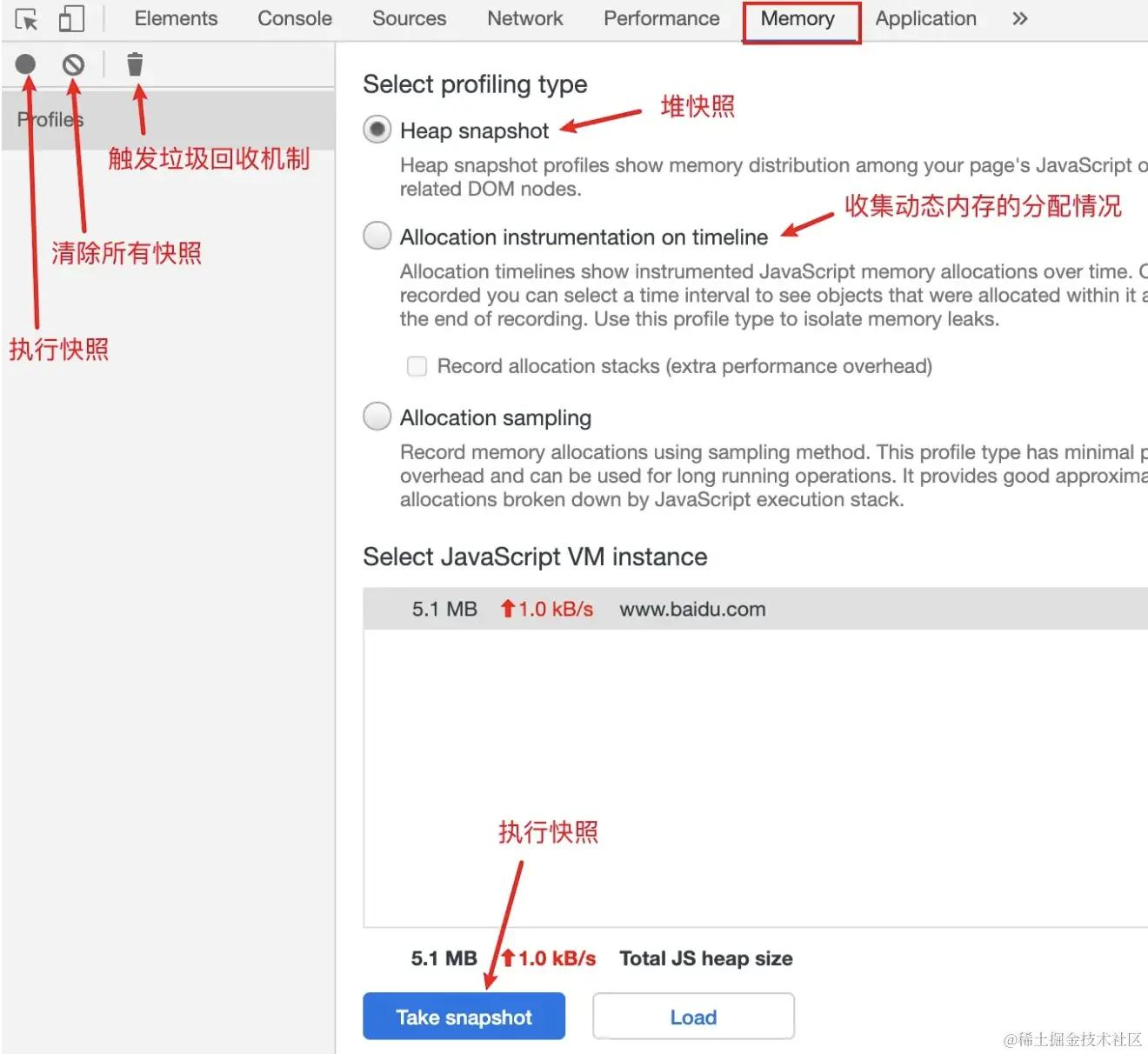 - Heap snapshot(堆快照):捕获当前内存中所有对象的快照,可对比不同快照的差异,适合定位未回收的对象;