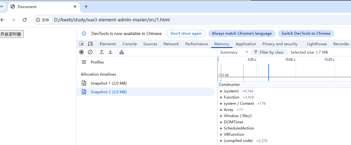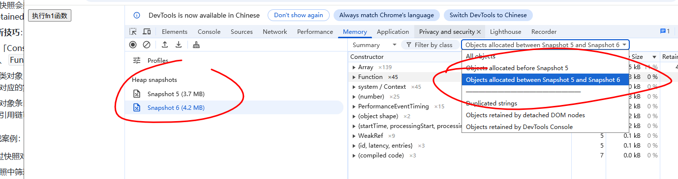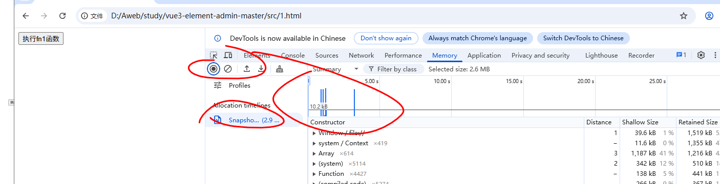 按道理来说点击按钮执行fn1函数后会退出该函数的执行上下文,紧跟着函数体内的局部变量应该被清除,但图中performance的录制结果显示似乎是存在内存泄漏问题的,即最终曲线高度比基准线高度要高,那么再用Memory来确认一次:
