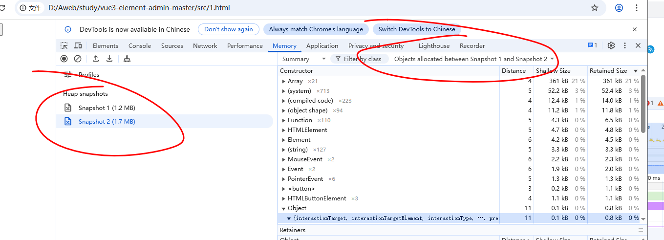 - 第一次先点击快照记录初始的内存情况,然后我们多次点击按钮后再次点击快照,记录此时的内存情况,发现从原来的1.2 M内存空间变成了1.7 M内存空间,然后我们选中第二条快照记录,可以看到右上角有个All objects的字段,其表示展示的是当前选中的快照记录所有对象的分配情况,而我们想要知道的是第5条快照与第一条快照的区别在哪,所以选择Object allocated between Snapshot1 and Snapshot2即展示第一条快照和第二条快照存在差异的内存对象分配情况,此时可以看到Array的百分比很高,初步可以判断是该变量存在问题,点击查看详情后就能查看到该变量对应的具体数据了