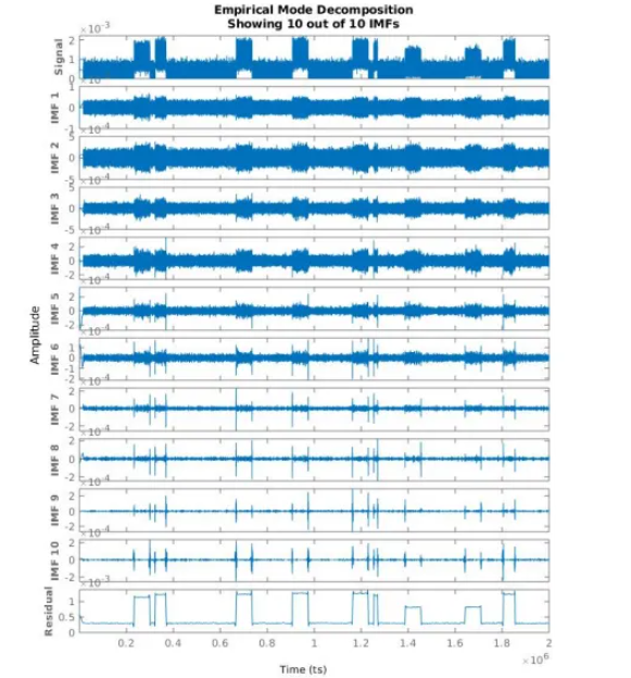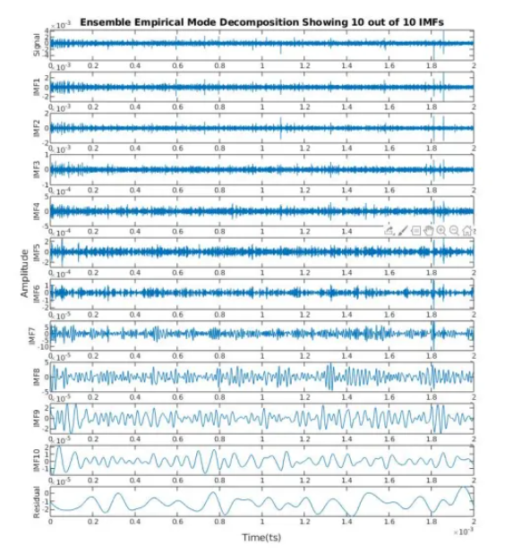 其中, IMFsk(n)IMFs_k(n)IMFsk(n) 表示第k个固有模态函数(IMF),对应频率成分 ckc_kck , r(n)r(n)r(n) 为局部极值与最终分解的IMF信号之间的残差,本文中K取值为10。
