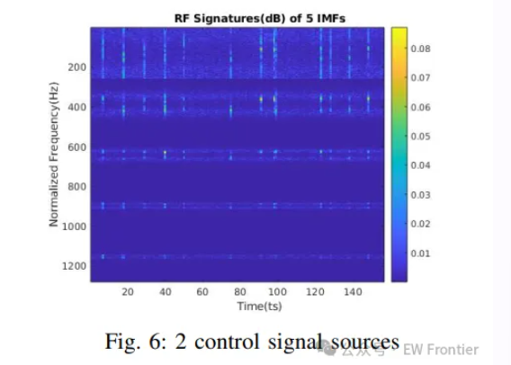 为观察不同固有模态函数的时频谱特征,对每个IMF进行短时傅里叶变换(STFT),获取信号的时频能量分布,以突出识别信号的特征。实验结果显示,EEMD分解后,第1至5个IMF的主成分在时域上具有稳定的信号强度,且能清晰区分数据包传输特征(如图5-7所示),甚至可识别多个控制信号源,为多无人机检测提供了可能。